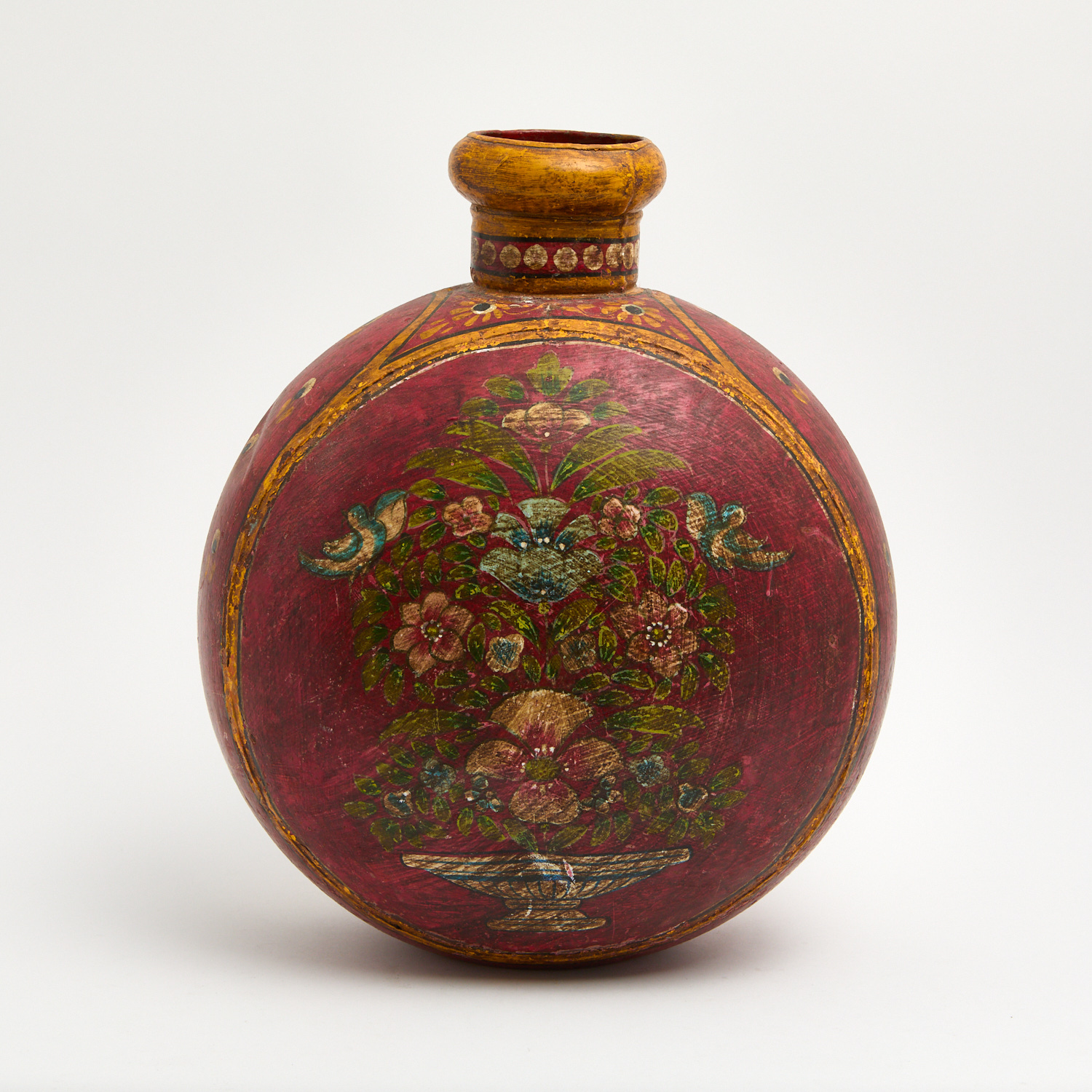 AN ANTIQUE INDIAN PAINTED METAL WATER POT (A/F) H.44CM