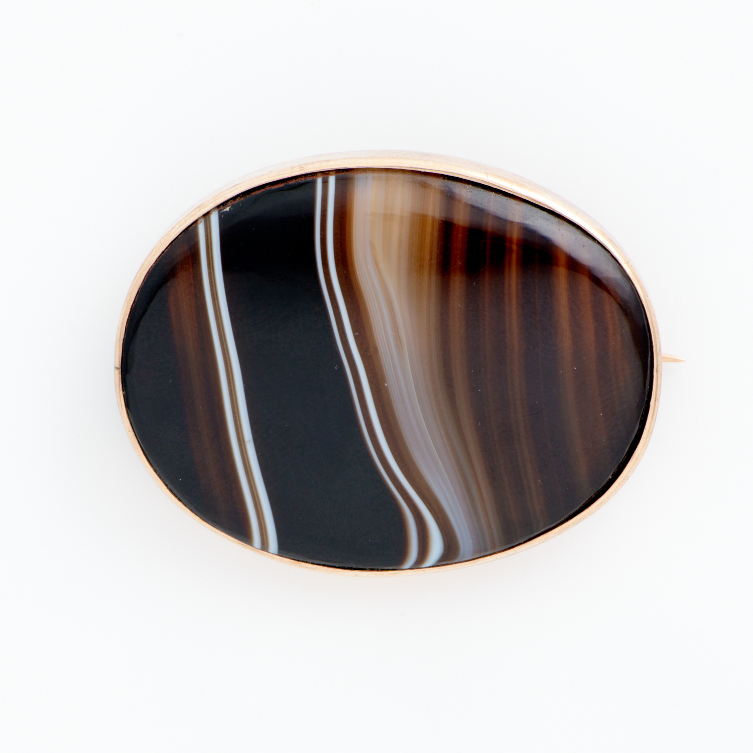 A BANDED AGATE BROOCH IN A 9CT GOLD FRAME, 45MM X 35MM, TOTAL WEIGHT 23.49GMS