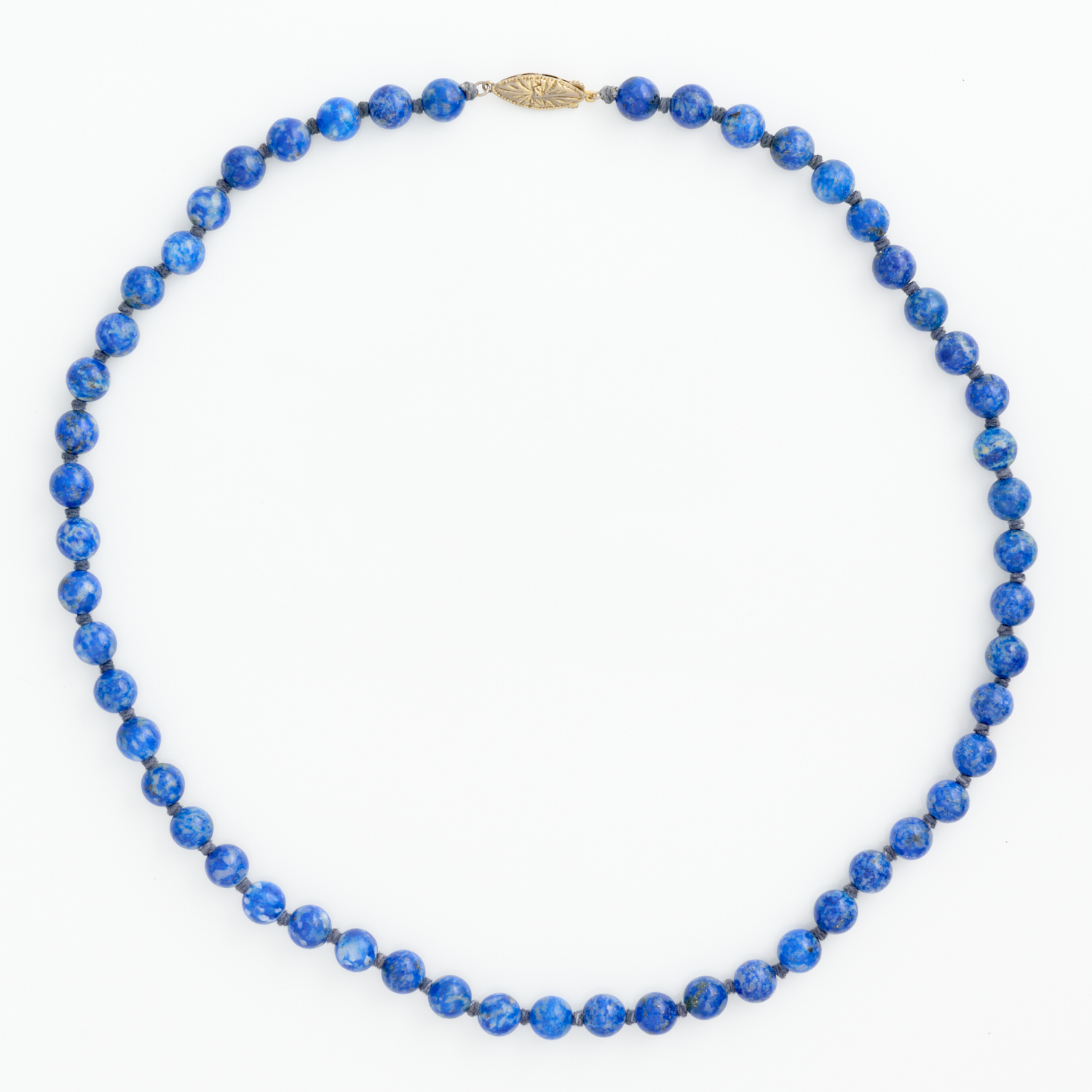 A STRAND OF SODALITE BEADS, TO A CLASP IN SILVER, 500MM