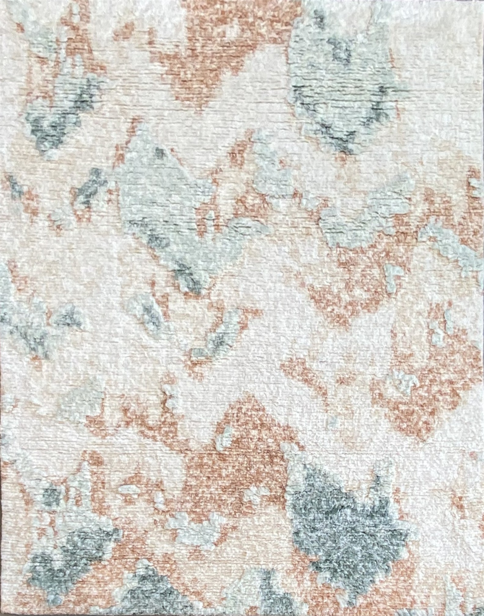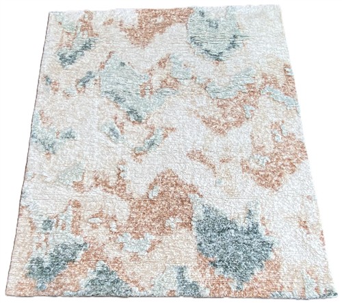 WOOLLEN WARP, WEFT & PILE. HAND-KNOTTED. SOFT PLUSH PILE IN CREAM WITH SOFT PASTEL-TONED PATTERNS IN PEACH & LIGHT TURQUOISE.