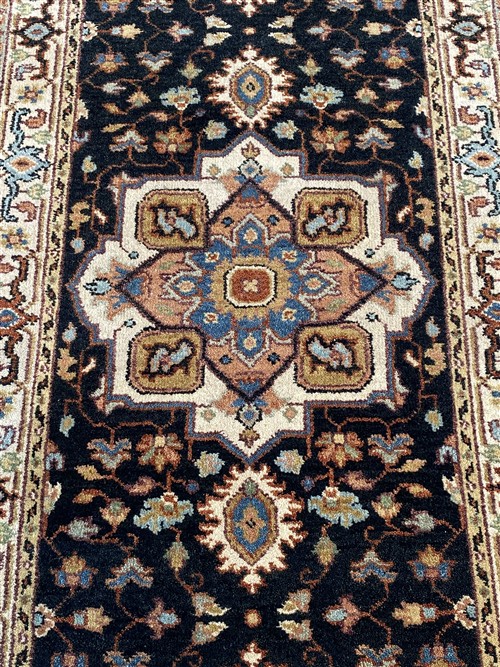 HAND-SPUN WOOLLEN PILE AND NATURAL DYES. HAND-KNOTTED WEAVE WITH TRADITIONAL HERIZ DESIGN OF REPEATING STYLIZED MEDALLIONS IN A FIELD OF FLORAL MOTIFS. HERATI-PATTERNED BORDER. THE ENTIRE IN HUES OF INDIGO, BLUE, TERRACOTTA & IVORY.