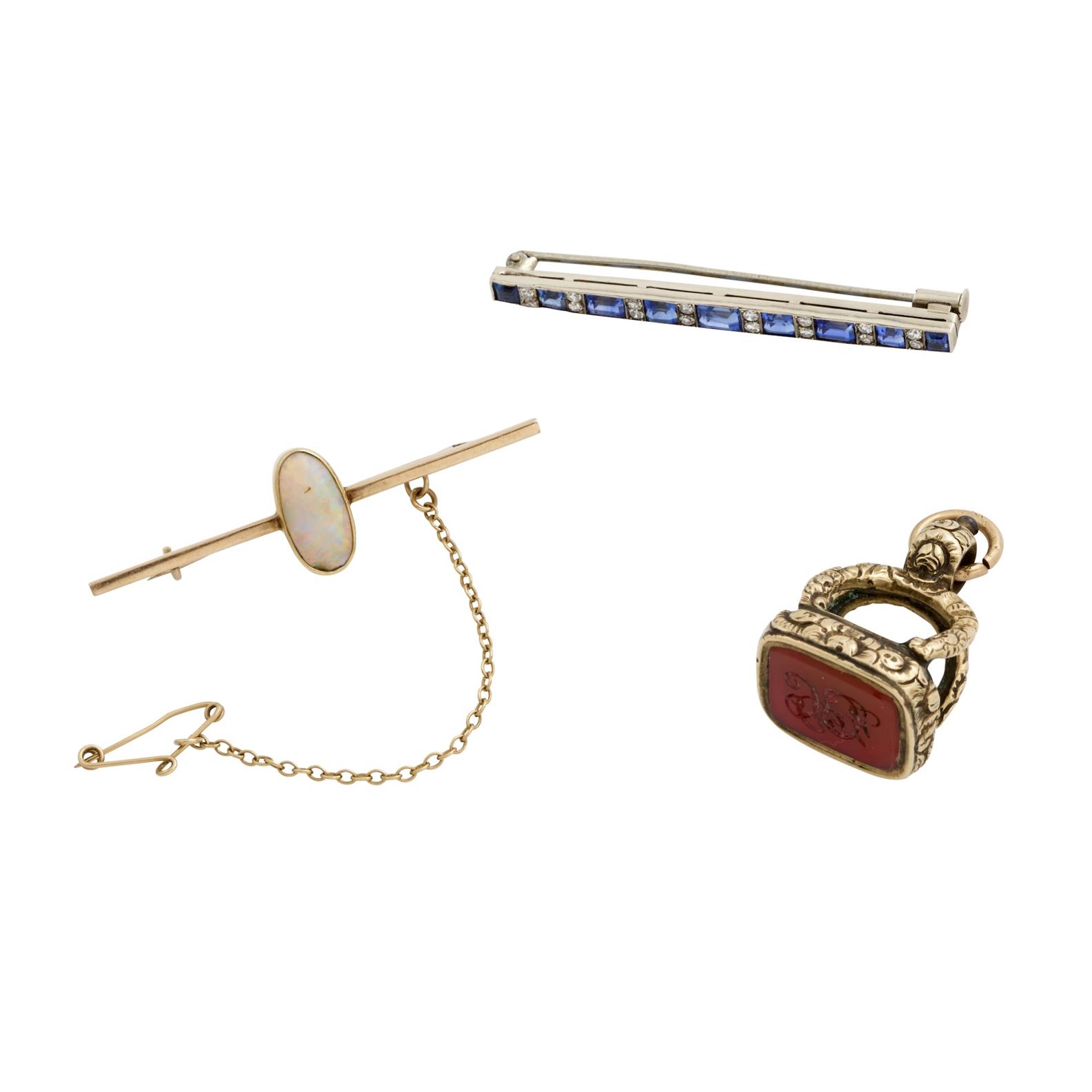 Comprising of: a carnelian seal with engraved initials, a gold 9ct brooch centring a collet-set opal, and a brooch of channel-set synthetic sapphires alternating with pavé-set single-cut diamonds, mounted in low carat white gold, fob length 33mm, brooch length 50mm each, gross weight approximately 19.1 grams.