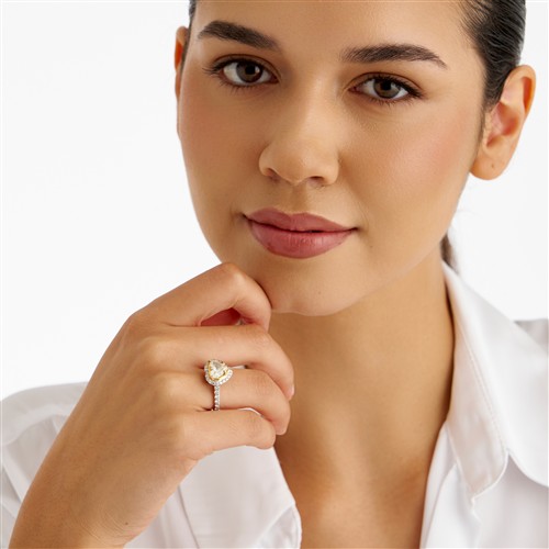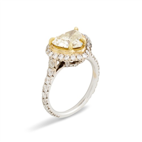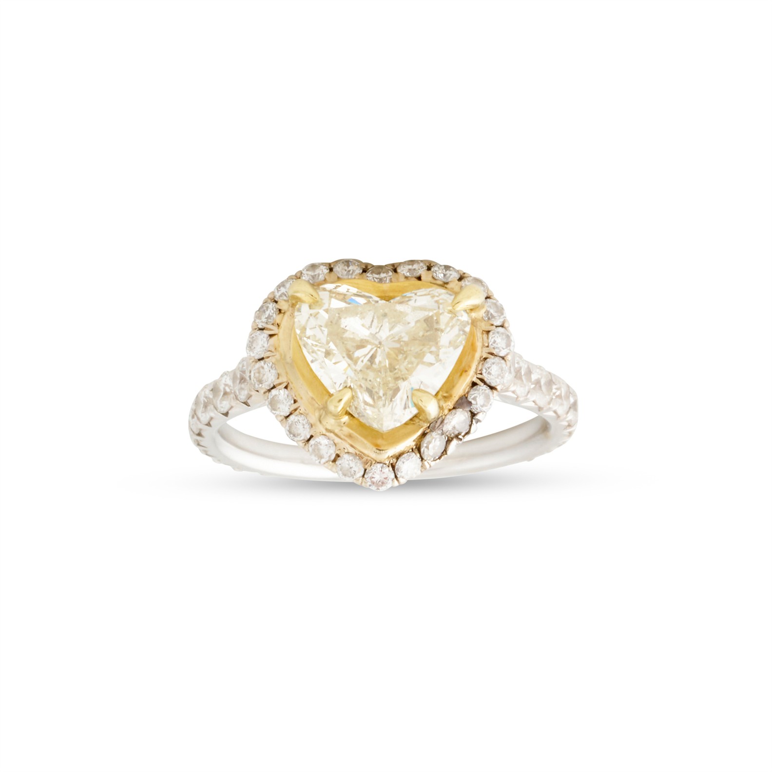 Of cluster design, centring a claw-set heart brilliant-cut light yellow diamond weighing 1.80 carats, framed by claw-set brilliant-cut diamonds, to shoulders and gallery similarly set, the near colourless diamonds together weighing approximately 1.01 carats, mounted in 18ct white and yellow gold, size K1/2, gross weight approximately 5.1 grams.