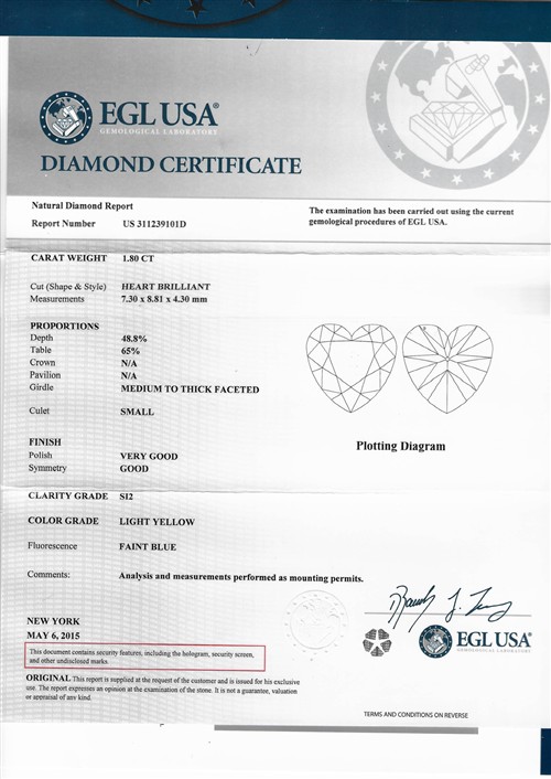 Accompanied by a UGS Diamond Certificate numbered US311239101D, dated 6 May 2015, stating that the 1.80 carat diamond is natural, light yellow in colour, S12 clarity.