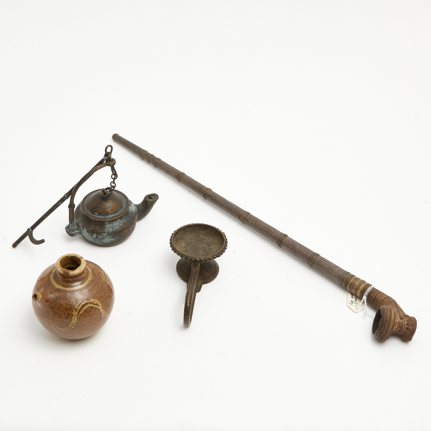 A GROUP OF CHINESE ITEMS INCL. OPIUM PIPE, TWO MINIATURE TEAPOTS AND OTHERS L.39CM (OPIUM PIPE)