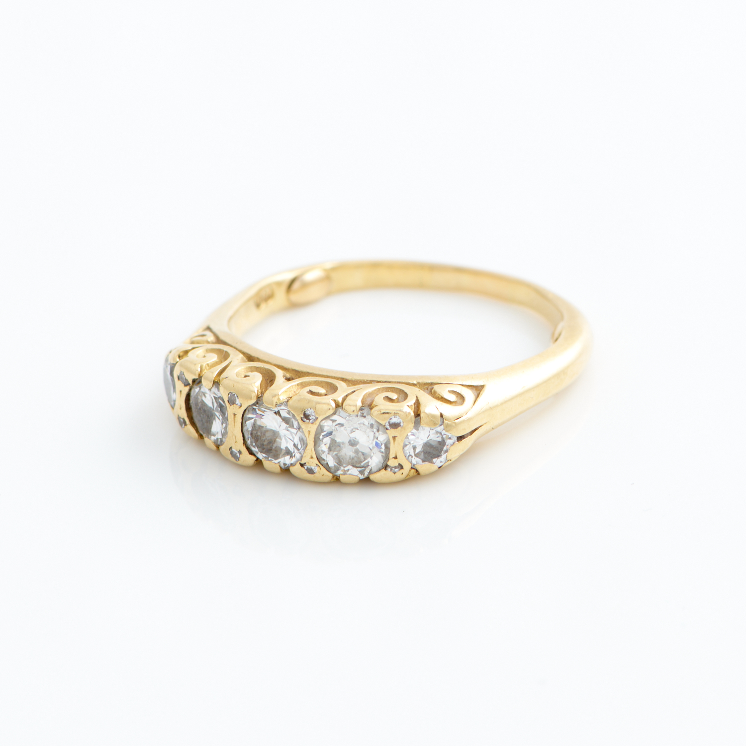 A FIVE STONE DIAMOND RING IN 18CT GOLD, SIZE P 1/2, 6.12GMS