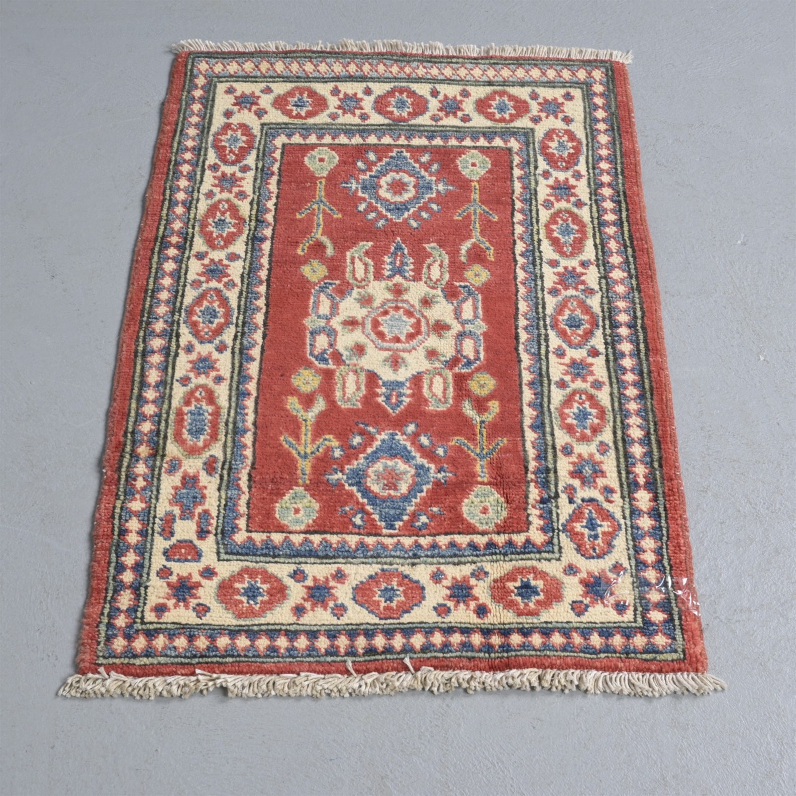 A SMALL HAND KNOTTED WOOLLEN RUG WITH VEGETABLE DYES, MADE IN AFGHANISTAN (99CM W X 64CM D)