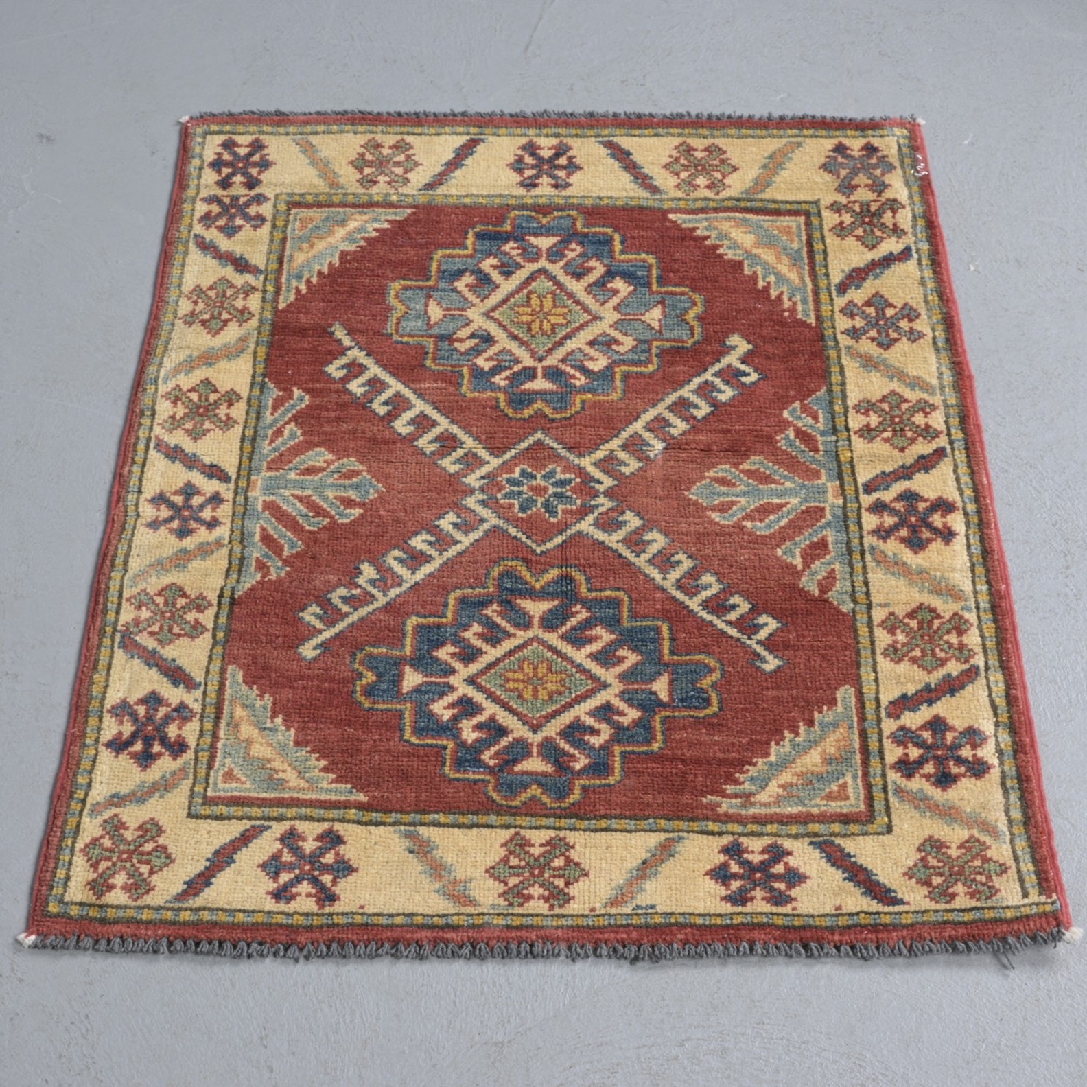 A SMALL HANDKNOTTED WOOLLEN RUG WITH VEGETABLE DYES, MADE IN AFGHANISTAN (98CM W X 78CM D)