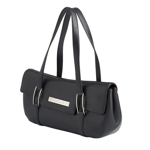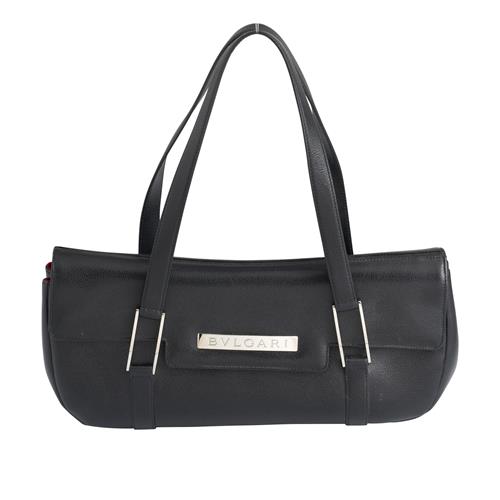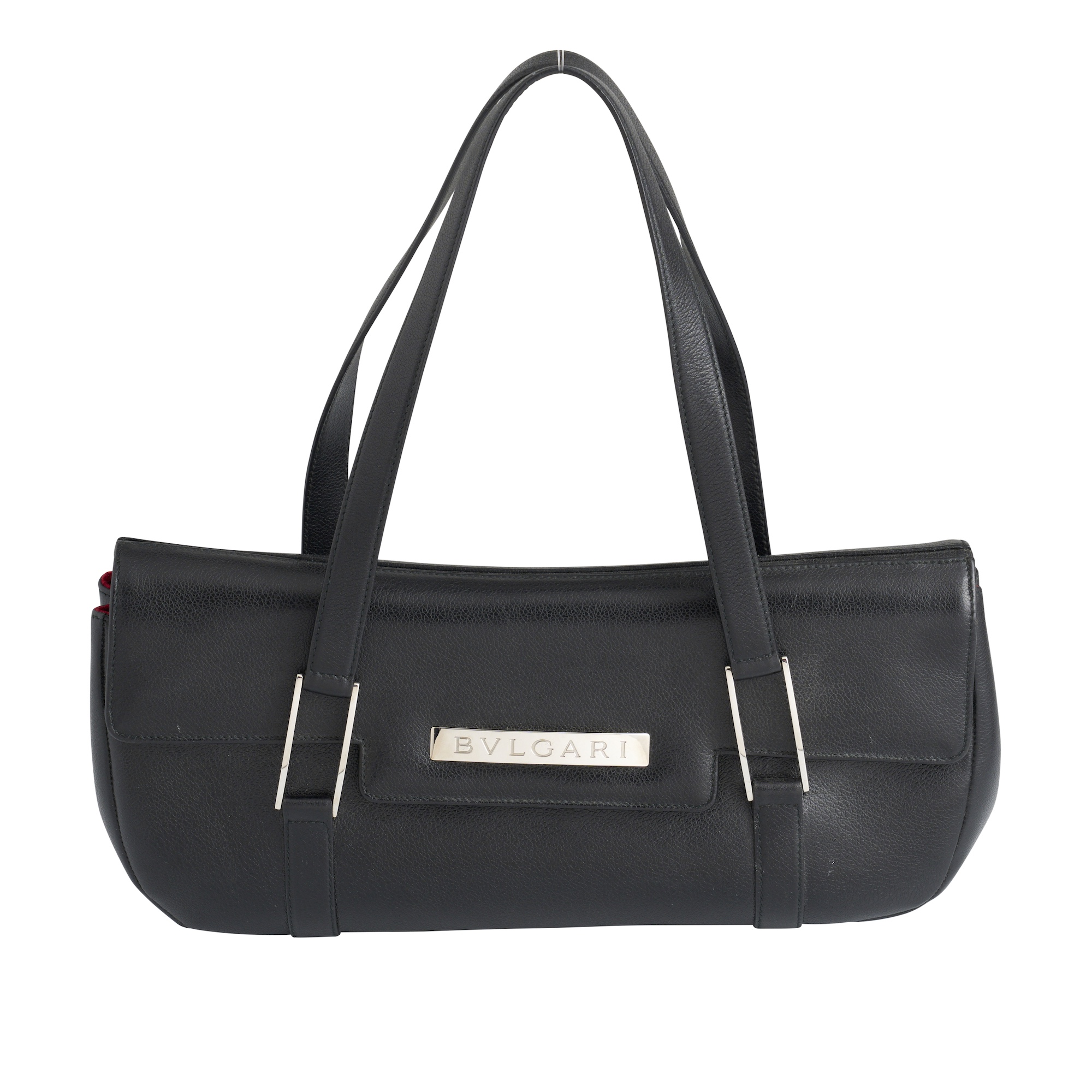 Styled in black leather with silver tone hardware featuring hardware logo plaque and buckle details, measures 36 x 15 x 8 cm.