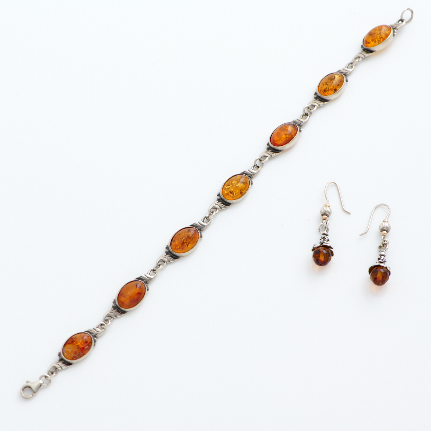 A PAIR OF AMBER EARRINGS IN SILVER, TO SHEPHERD HOOK FITTINGS, DROP LENGTH 30MM, TOGETHER WITH AN AMBER BRACELET IN SILVER , 180MM
