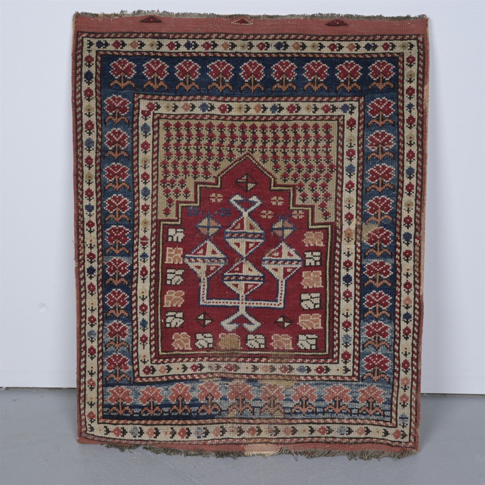 AN ANTIQUE KONYA PRAYER RUG (STRETCHED ON WOODEN SUPPORT) (A/F) (113CM L X 90CM W)