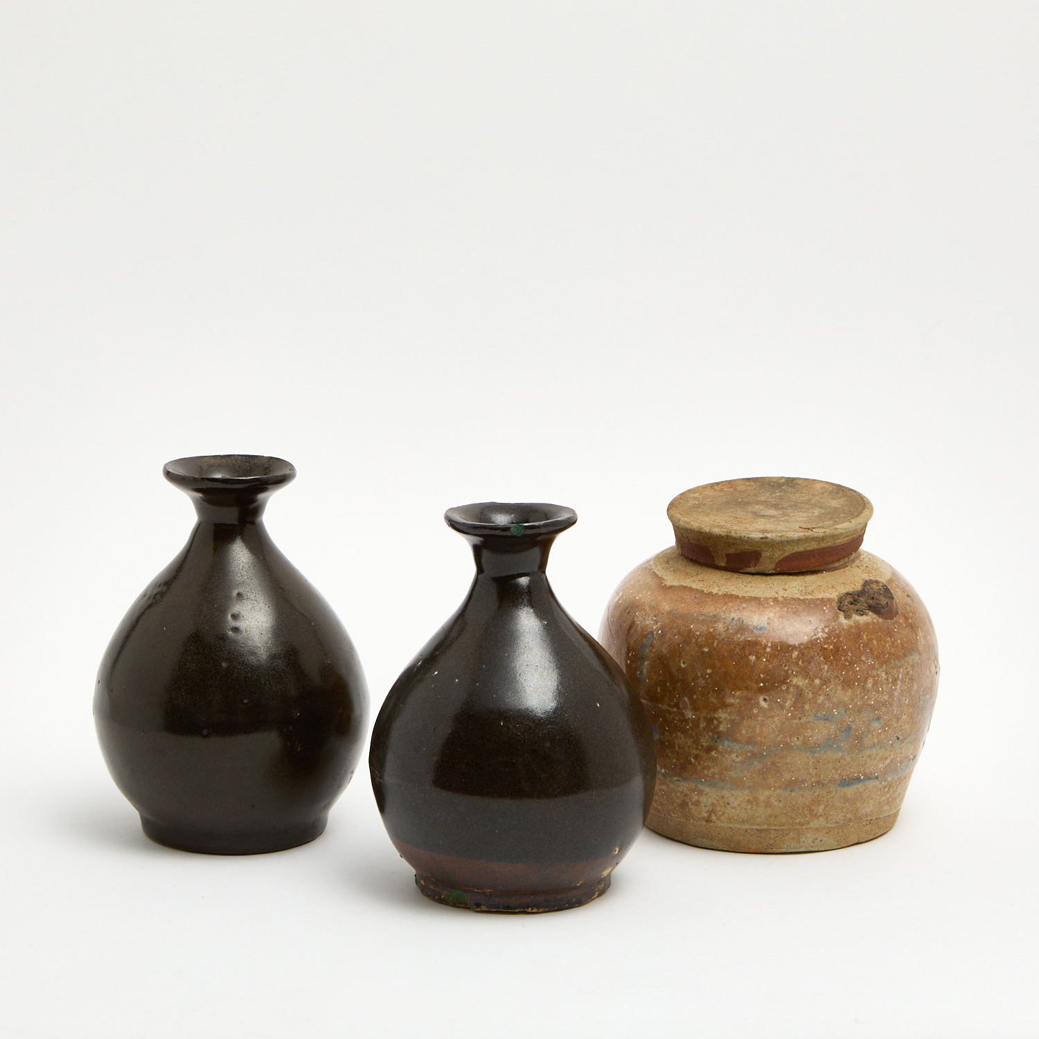 TWO NINETEENTH CENTURY CHINESE GOLDFIELDS WHISKY BOTTLES AND LIDDED GINGER JAR H.18CM