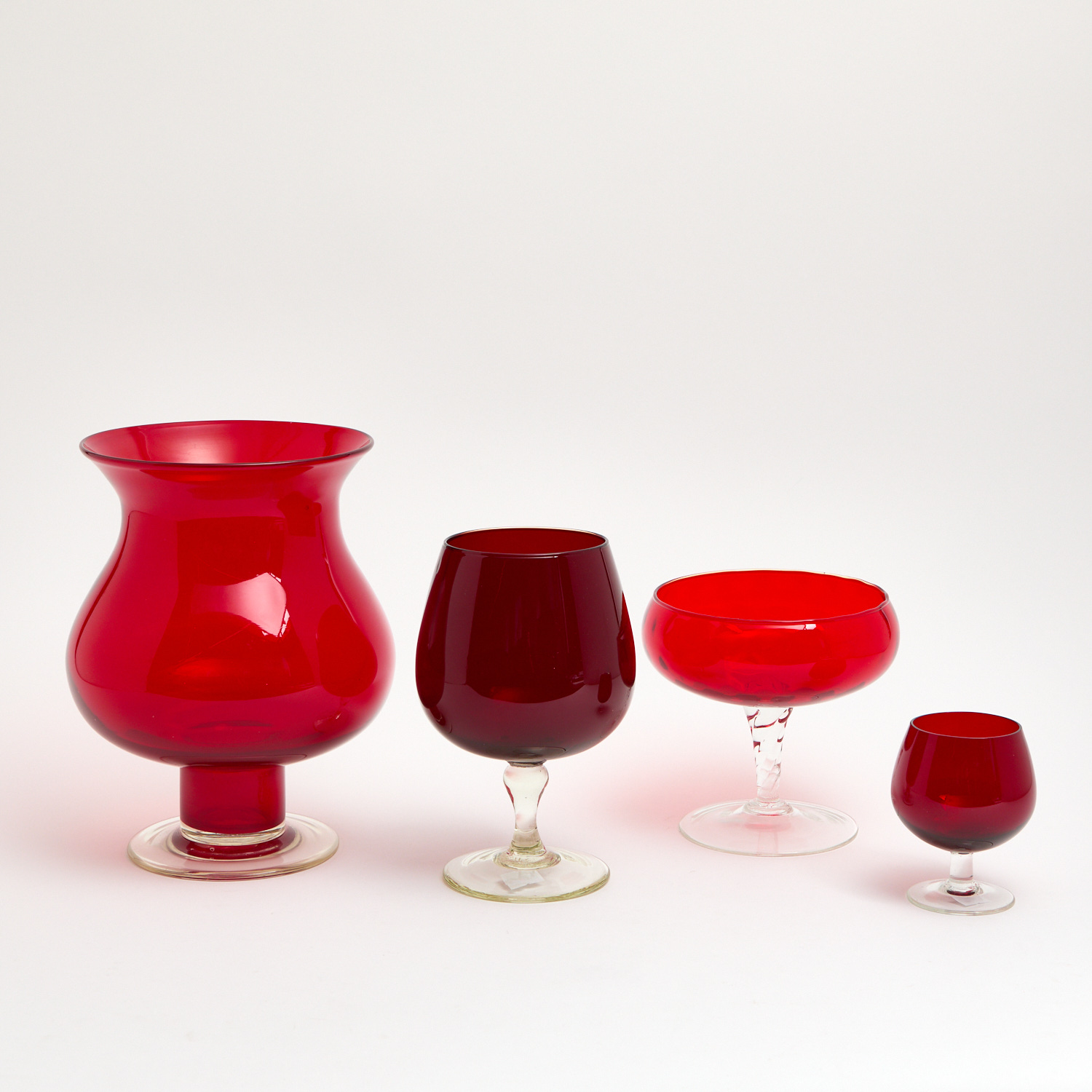 FOUR HAND-BLOWN RED GLASS VESSELS H.26CM