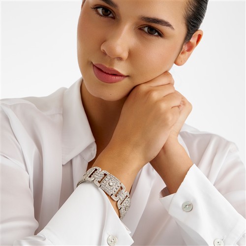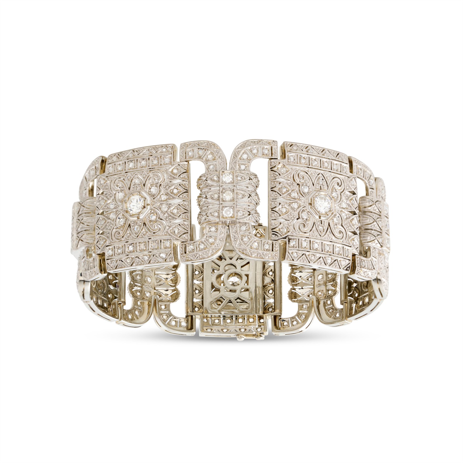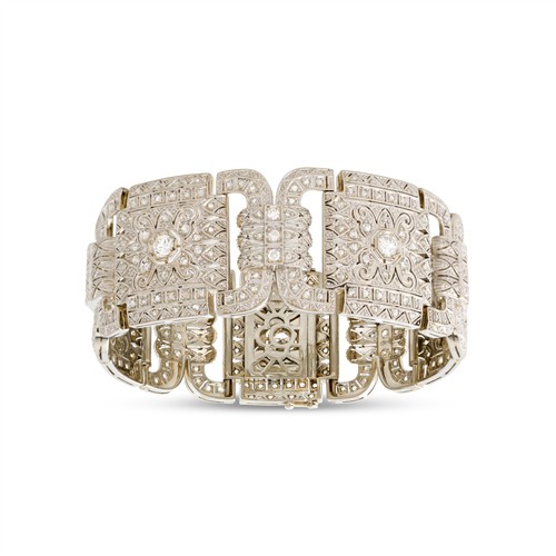 The 26mm wide strap is composed of articulated openwork plaques of geometric design each centring a claw-set old European-cut diamond and embellished with rose-cut diamonds, between stylised buckle motif connectors, the diamonds together weighing approximately 3.50 - 4.00 carats, mounted in 18ct white gold and platinum, length 185mm, gross weight approximately 53.8 grams.