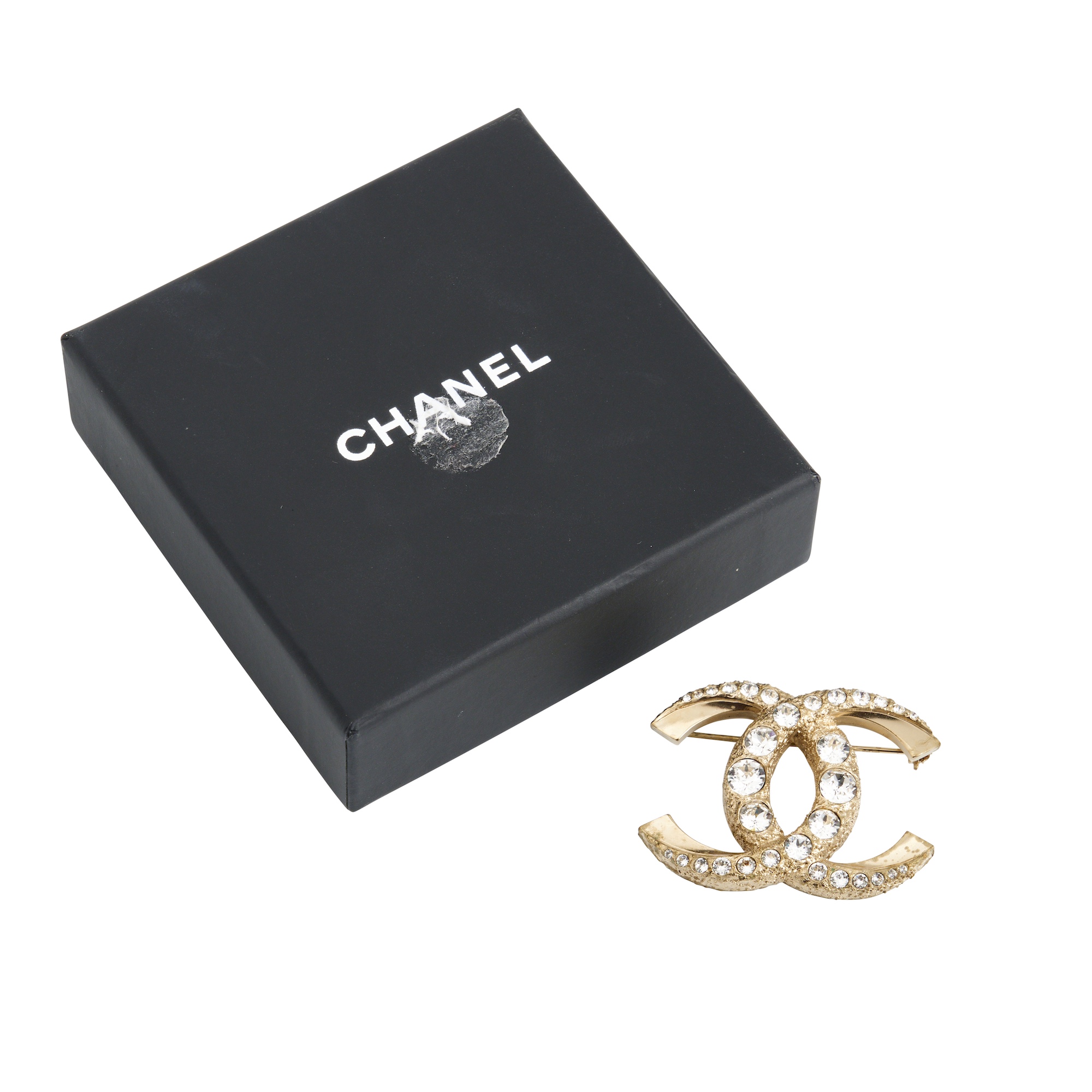 Styled as a 'CC' logo in gold tone metal with textured affect, studded with gems of gradiating size, to pin fastener, measures 5 x 3.5 cm.