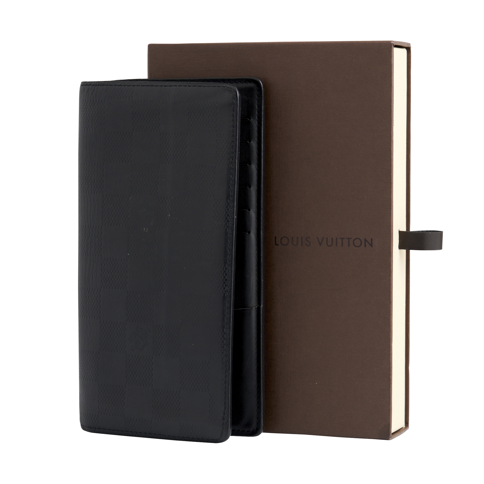 Styled in black Damier embossed leather, measures 19 x 10 cm.