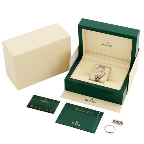 Accessories: Rolex international guarantee card dated 24.10.2020, card holder, guarantee manual/worldwide service booklet, Everose gold fluted bezel, five additional links and presentation box