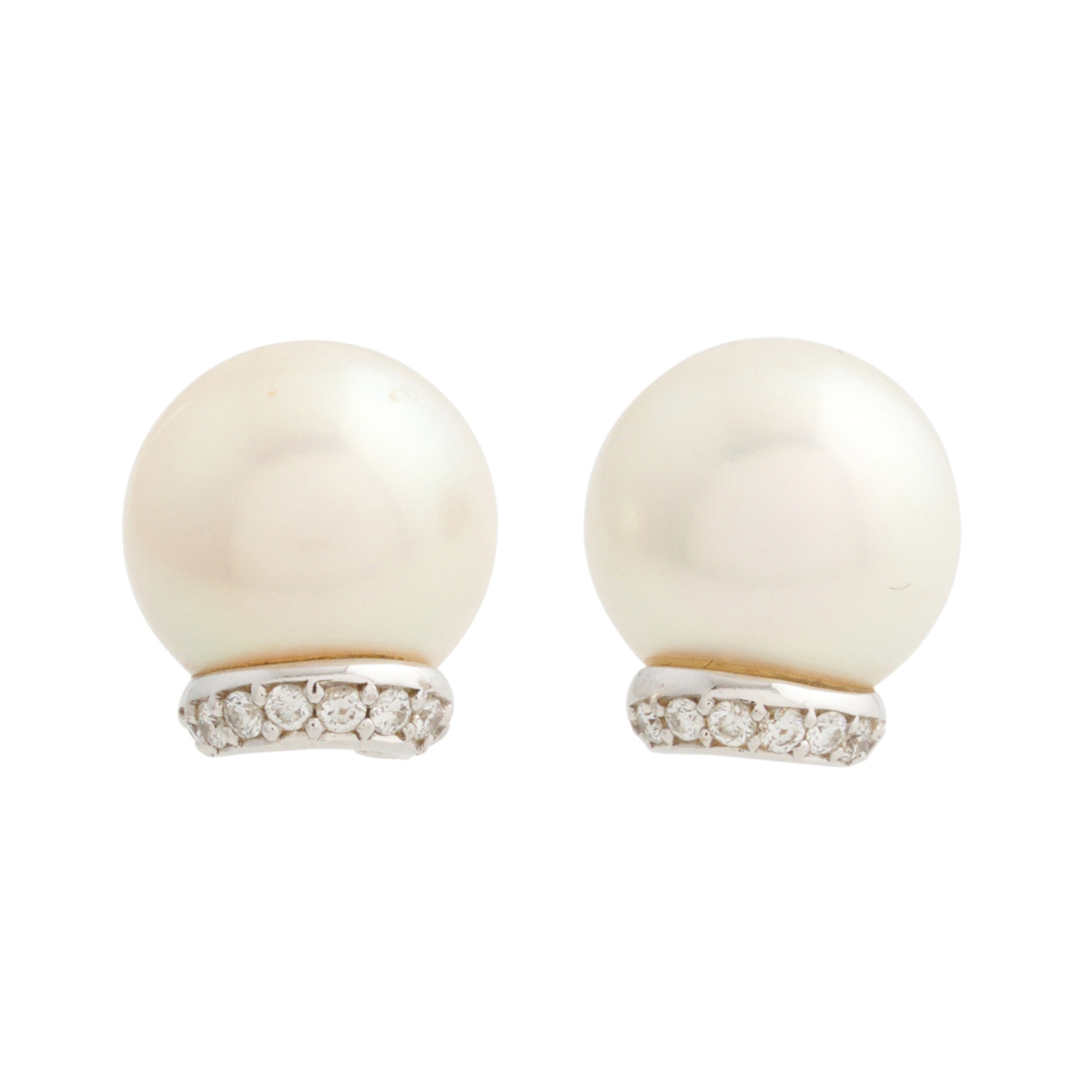 Each earring comprising a round cultured pearl of cream hues measuring approximately 8.00mm, with brilliant-cut diamond detailing, the diamonds together weighing approximately 0.10 carats, stamped Mikimoto, to post and butterfly fittings, gross weight approximately 3.2 grams.