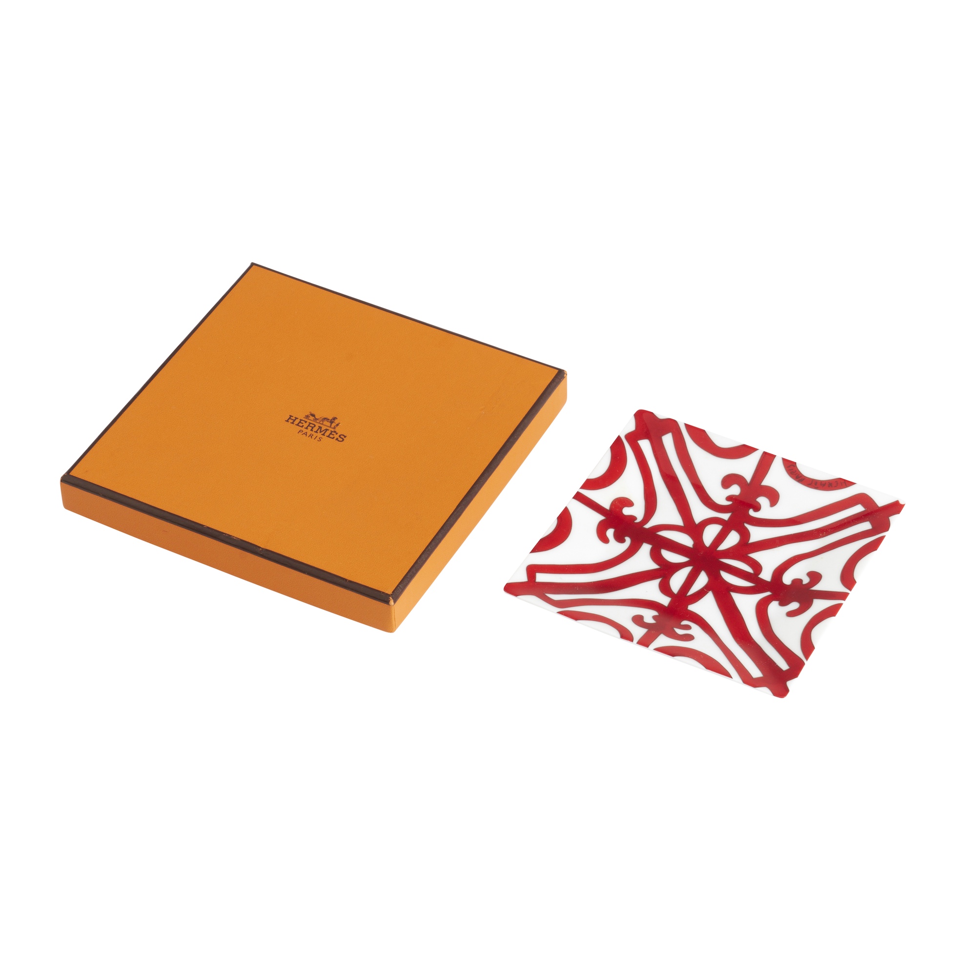 Styled in white porcelain with red painted filigree pattern, measures 11 cm squared.