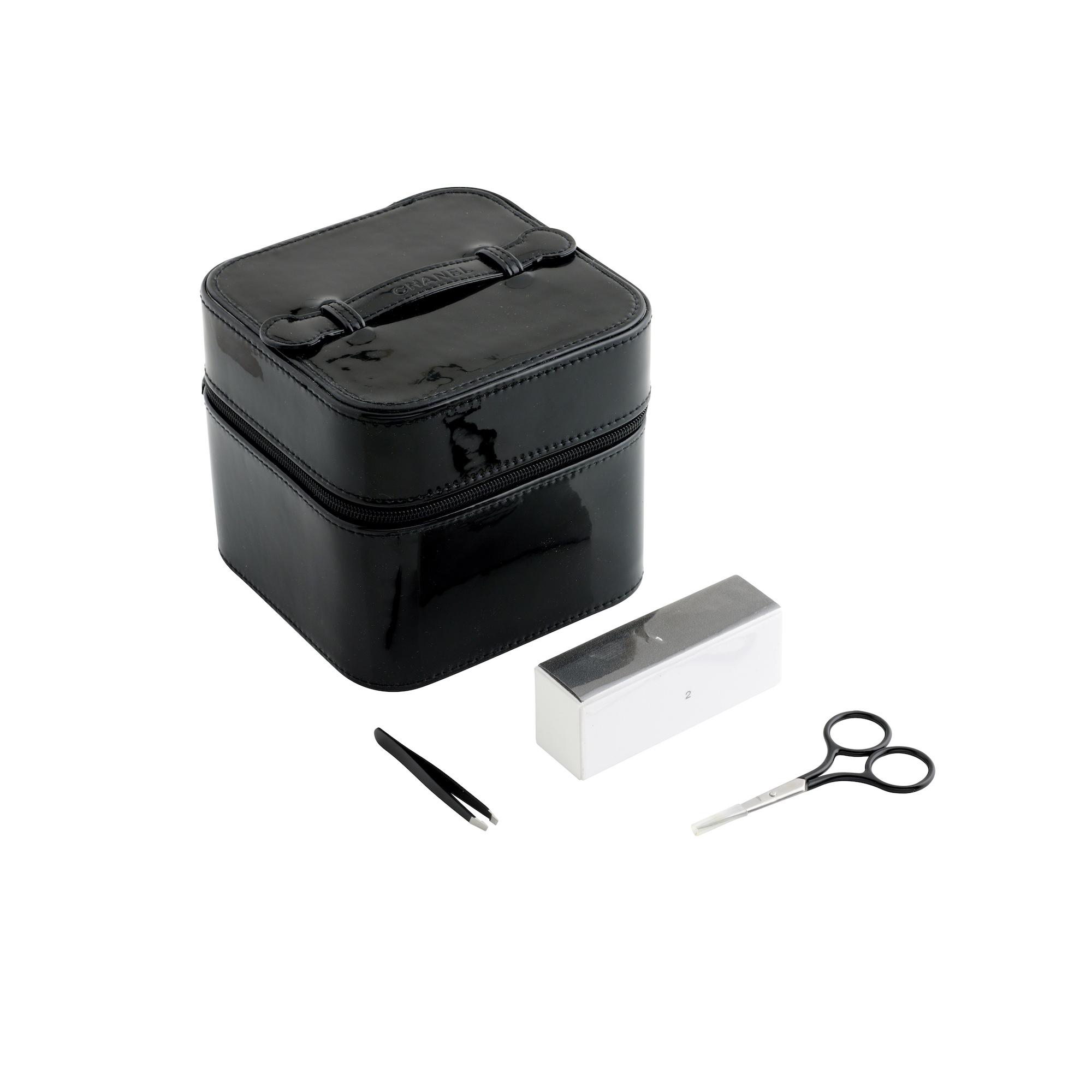 Styled in black patent leather with black fabric interior and elasticated tools holder, includes a nail buffer, file, scissors and tweezers, measures 13 x 12 x 13 cm.