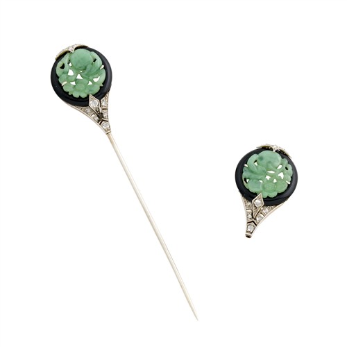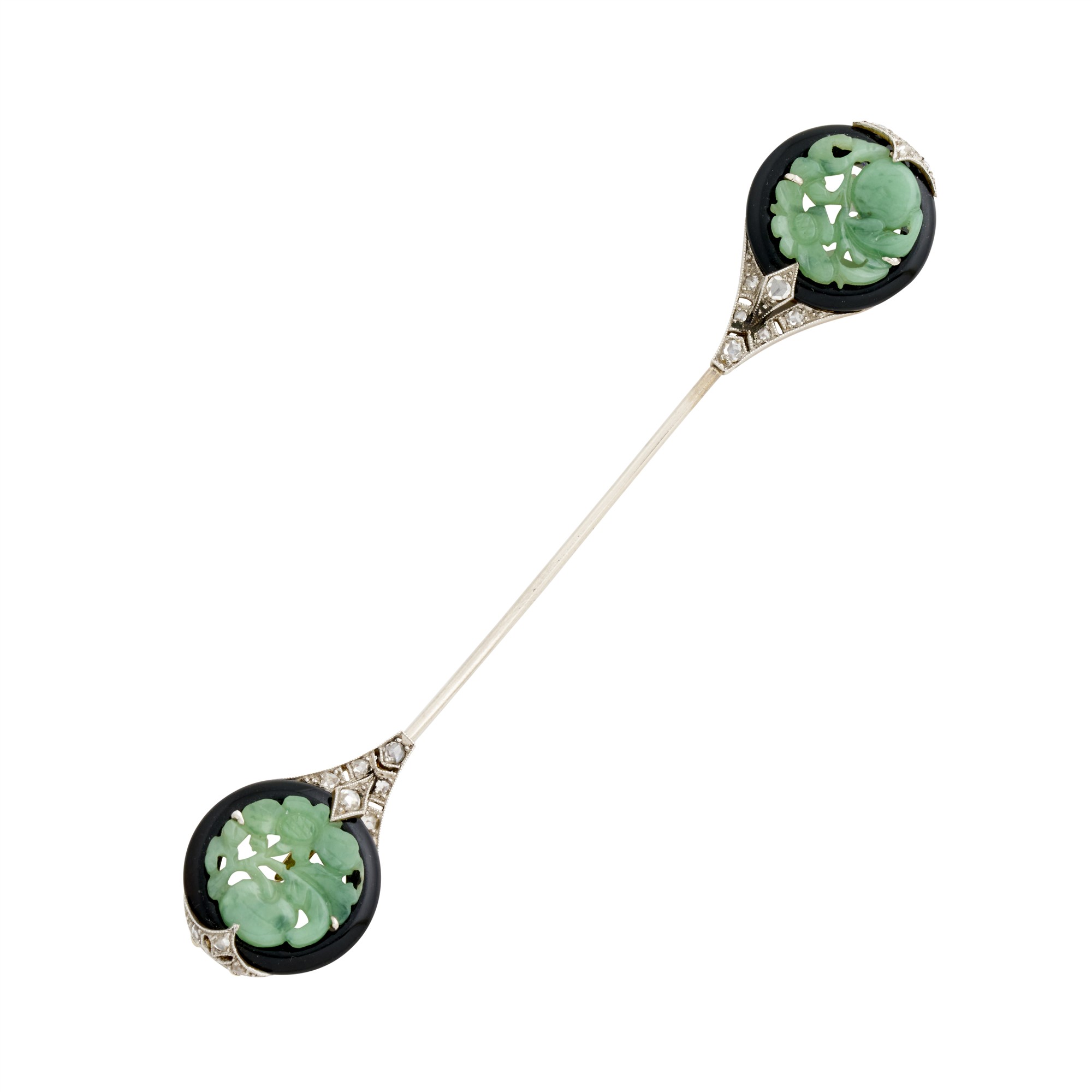 Art Deco Jabot pin with a bejewelled motif to the ends, styled as a pair of circular carved jadeite panels, surrounded by a half round circlet of black onyx raised on a double railed under-bezel, both panels enhanced by platinum millegrain edging with flared terminals of nine rose-cut diamonds to a platinum surette pin, the diamonds together weigh approximately 0.18 carats, length approximately 10mm, gross weight approximately 8.8 grams.