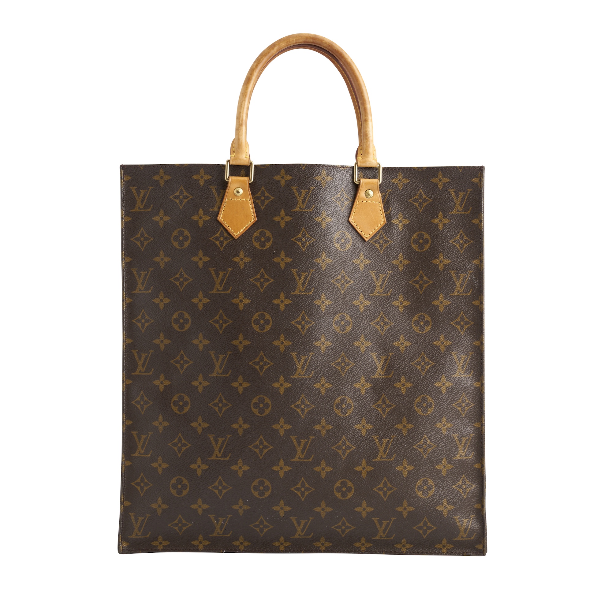 Styled in Monogram coated canvas with tan leather trim and gold tone hardware, measures 36 x 38 x 9 cm.