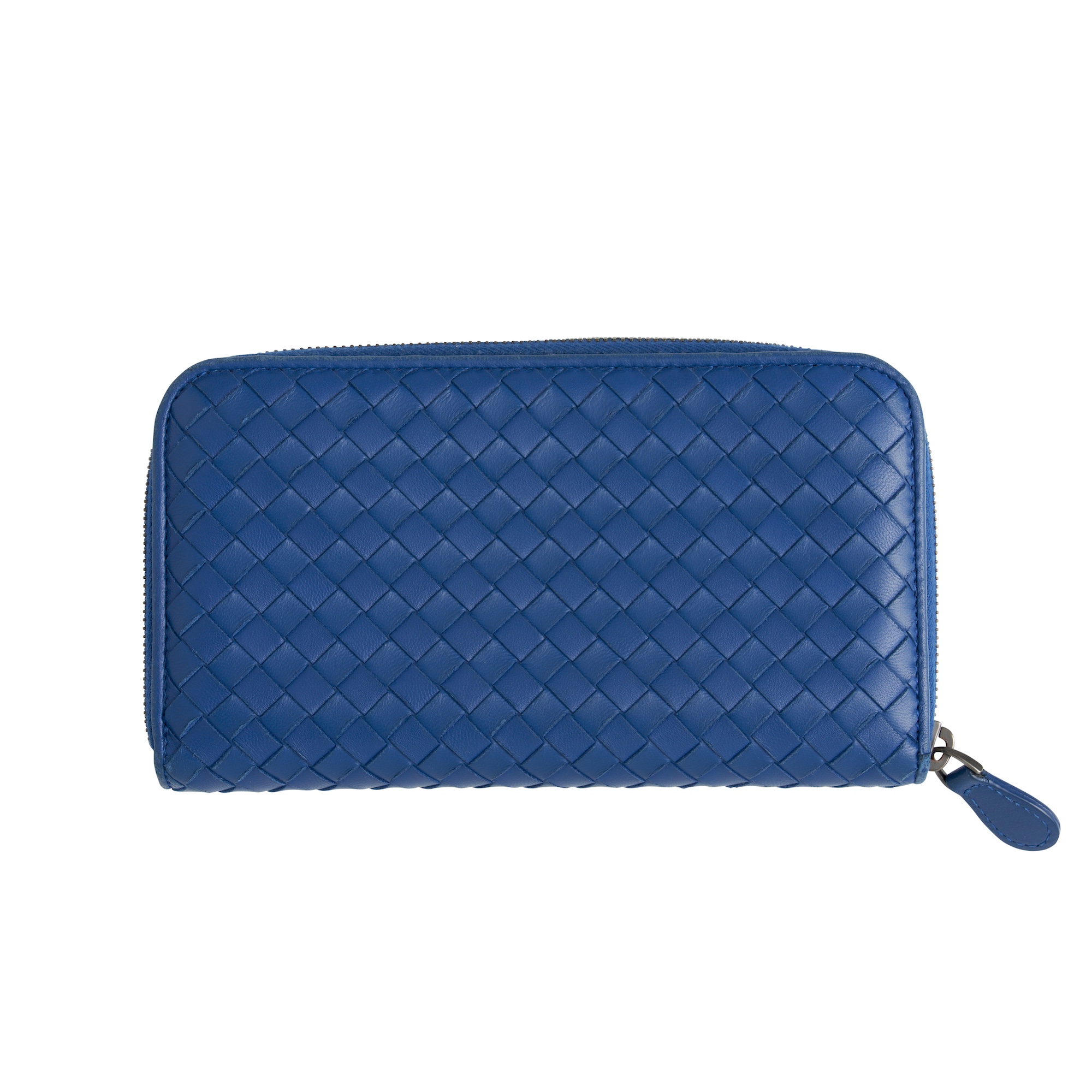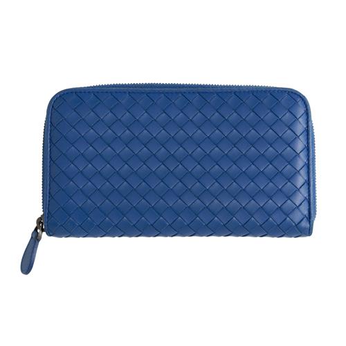 Styled in blue intreciatto woven nappa leather featuring silver tone hardware and zip around fastening, measures 19 x 10 x 2 cm.