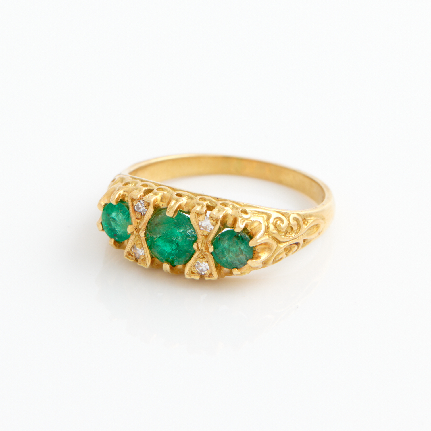 AN EMERALD AND DIAMOND RING IN 18CT GOLD, SIZE P 1/2, 4.6GMS