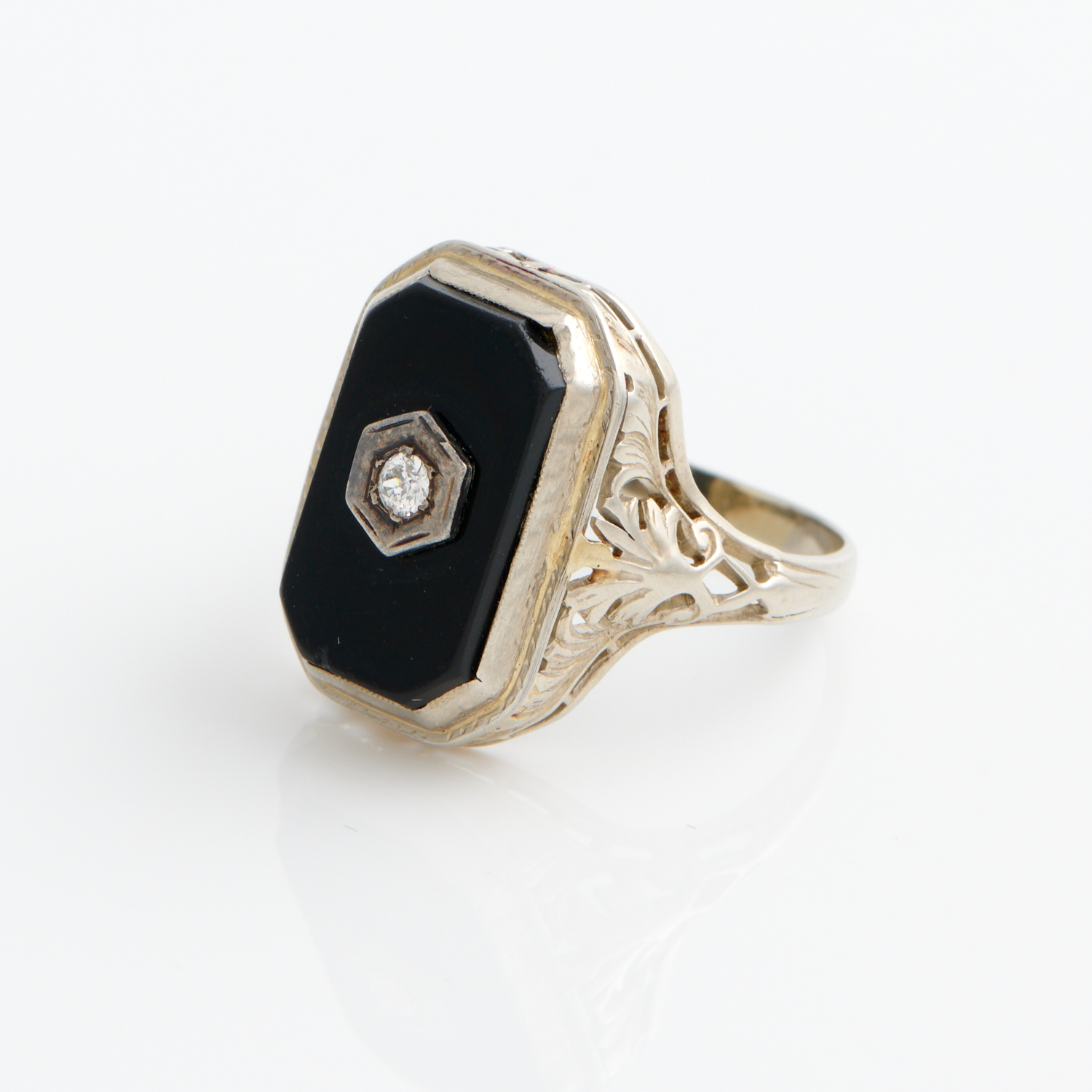 A DIAMOND AND ONYX RING IN 14CT WHITE GOLD, SIZE P, 4.4GMS