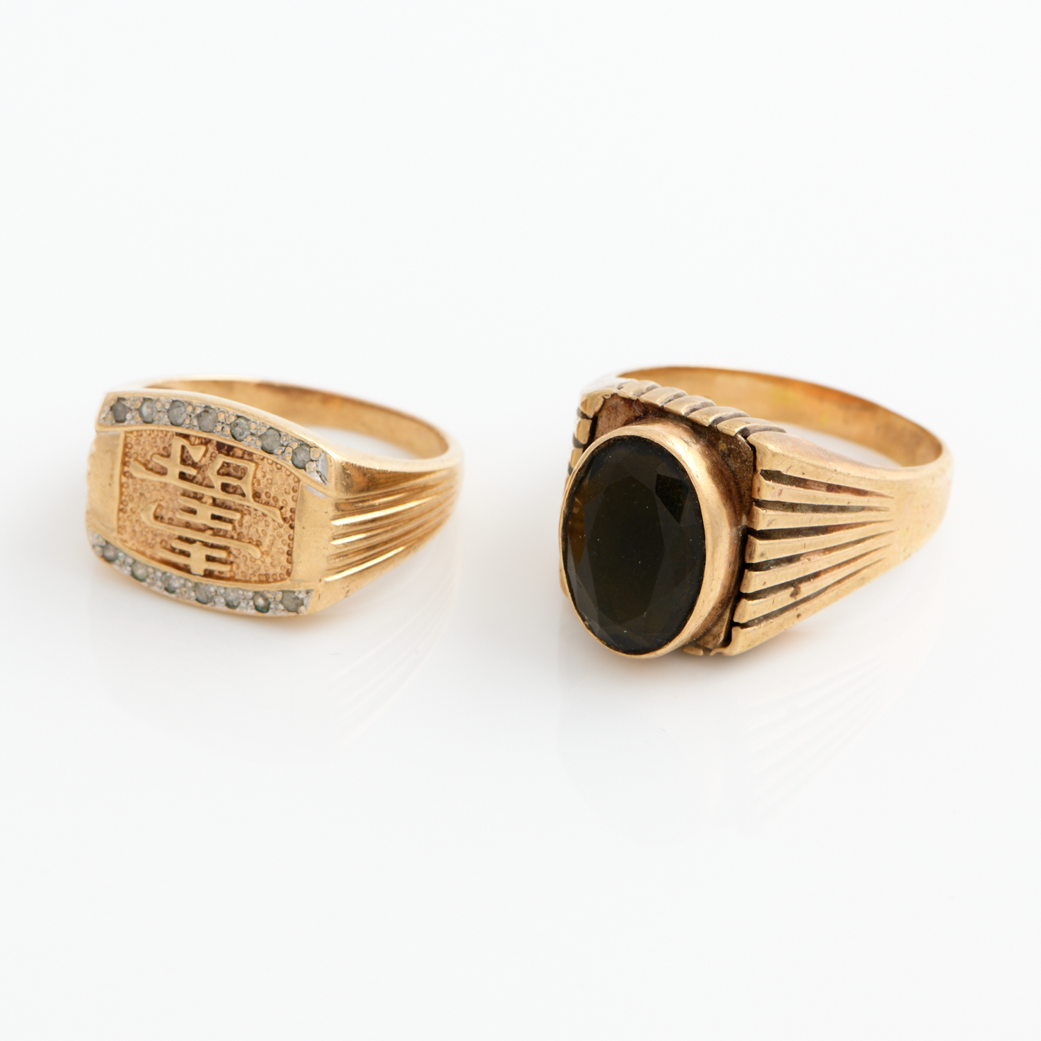 A PAIR OF RINGS IN 9CT GOLD, ONE QUARTZ SET, THE OTHER DIAMOND SET, THE LARGEST A SIZE X, TOTAL WEIGHT 15.9GMS