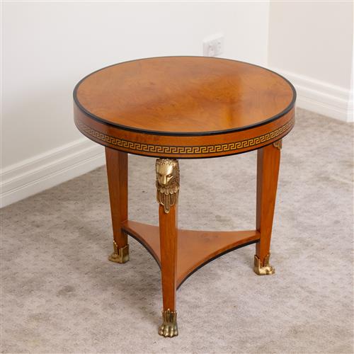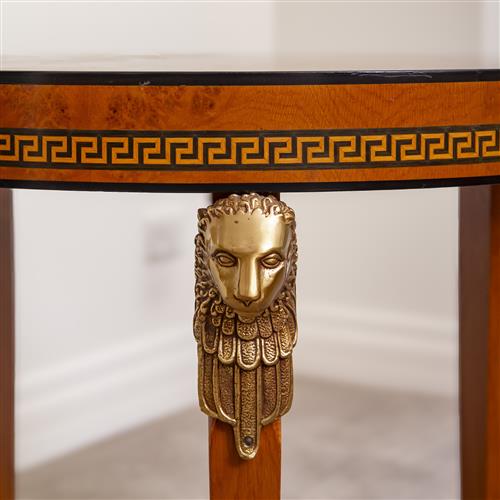 The table features gilt metal mounts and a finely inlaid Greek key banding. Marked to underside 'Made in Spain' and '1893'.