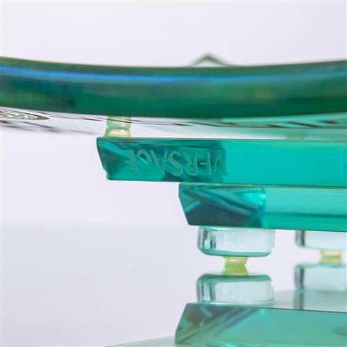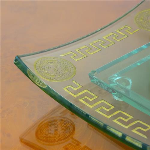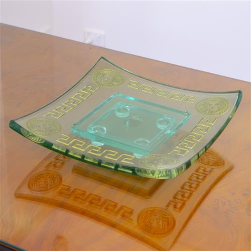 The footed glass centrepiece dish featuring an engraved Greek key border and head of Medusa both with a gilt finish. The piece comprises two separate components. Hand signed illegibly to underside and presents with acid etched 'VERSACE' signature.