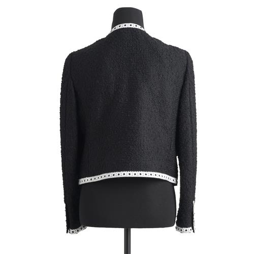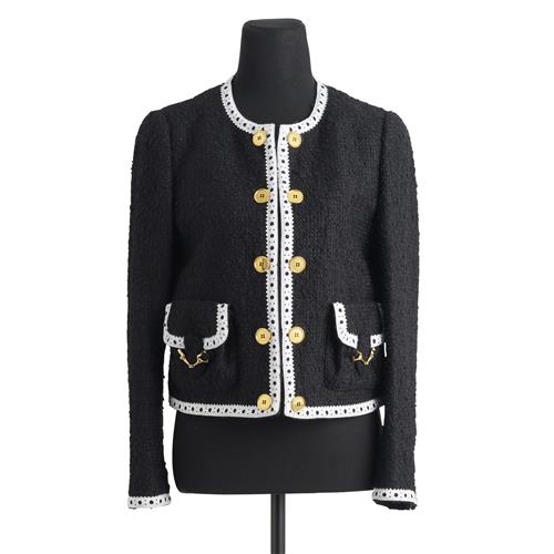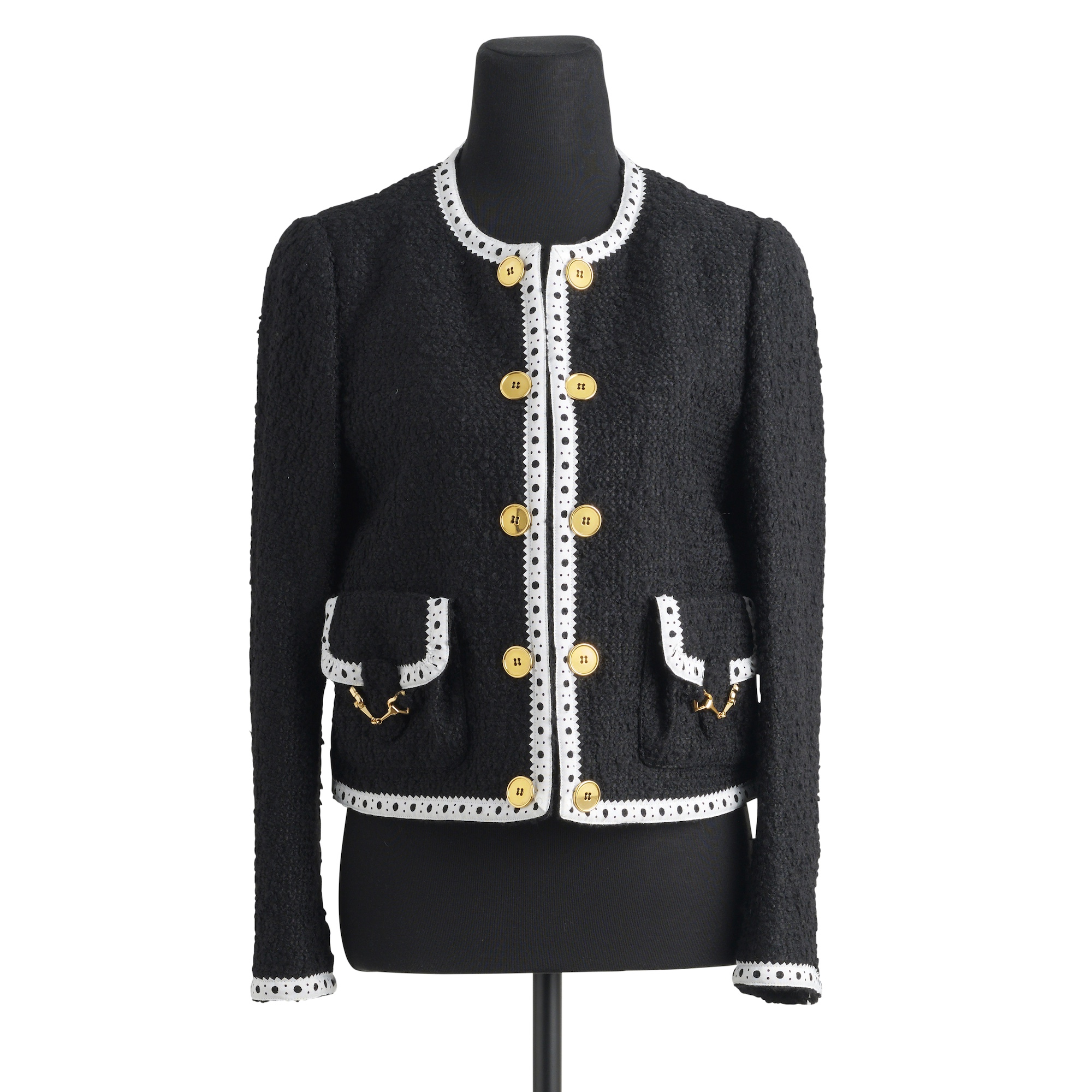 Styled in black Virgin wool blend with white minimalist cut out grosgrain trim, featuring gold buttons and love heart horsebit accents to pockets, marked size 12.