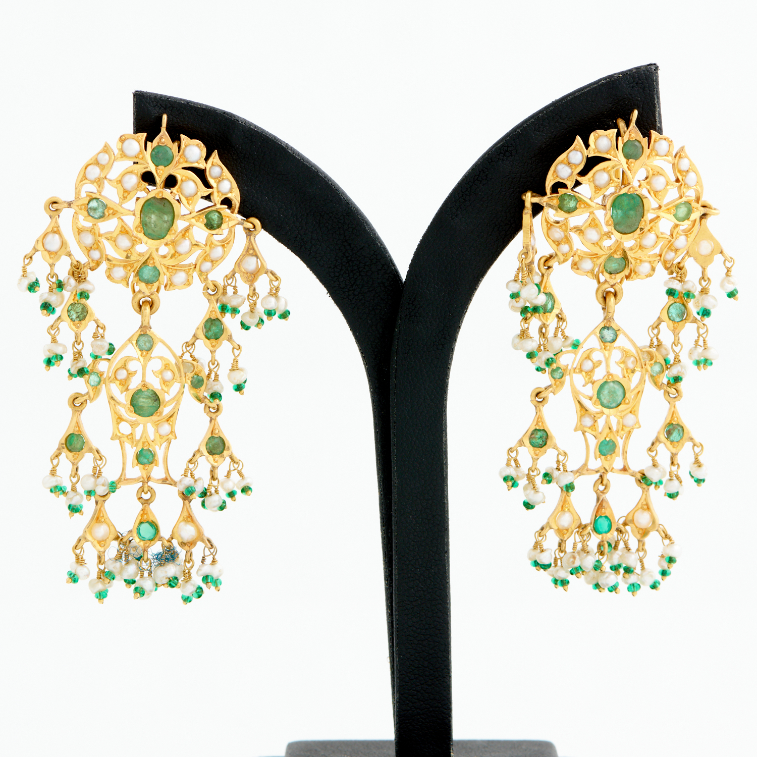 A PAIR OF INDIAN WEDDING EMERALD AND NATURAL PEARL EARRINGS IN 20CT GOLD, TO SHEPHERD HOOK FITTINGS, 70MM, 32.8GMS