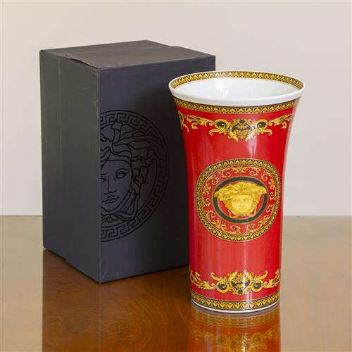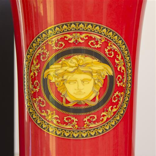 The porcelain vase in the Red Medusa pattern by Versace for Rosenthal. Made in Germany.