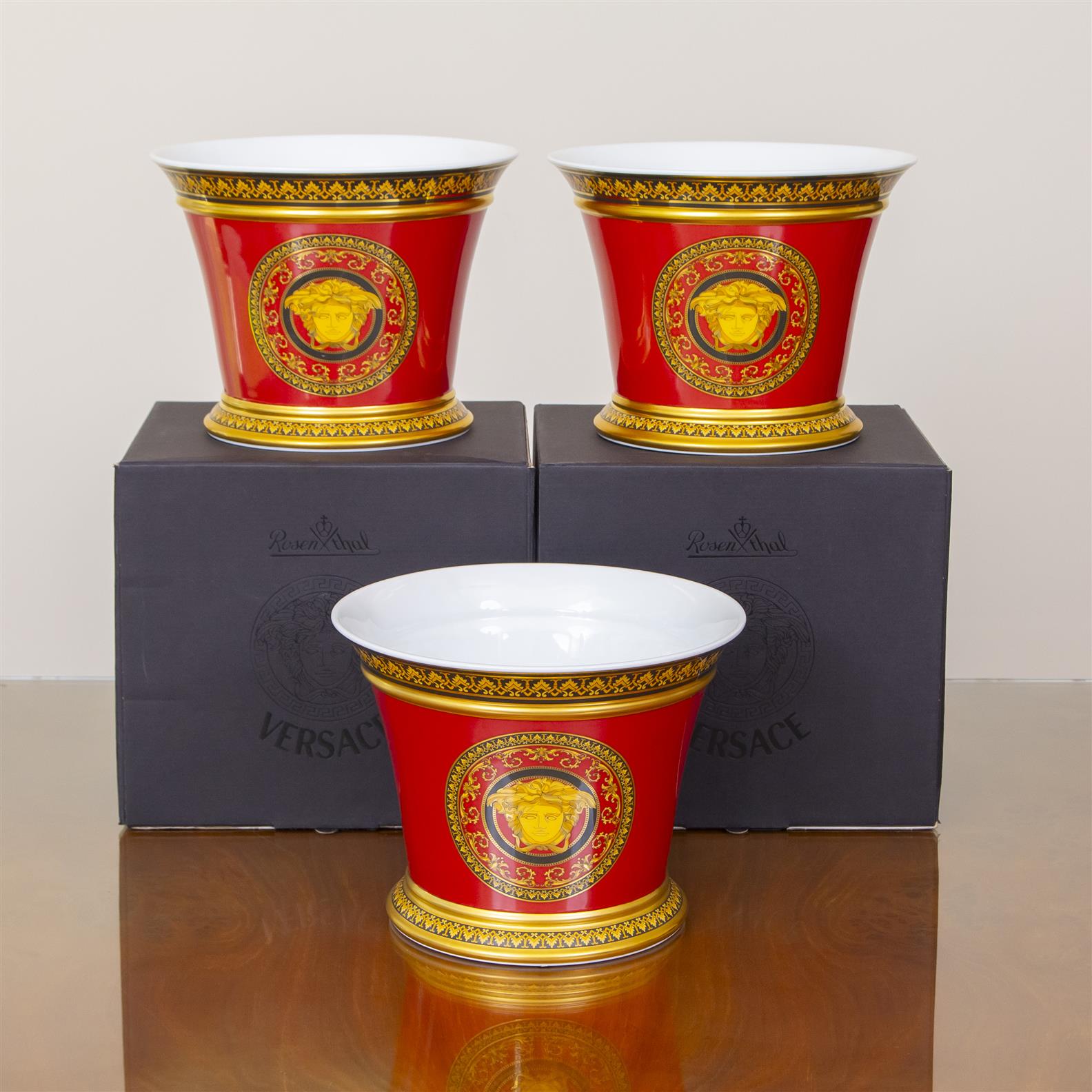 A GROUP OF THREE RED MEDUSA FLOWER POTS BY VERSACE FOR ROSENTHAL