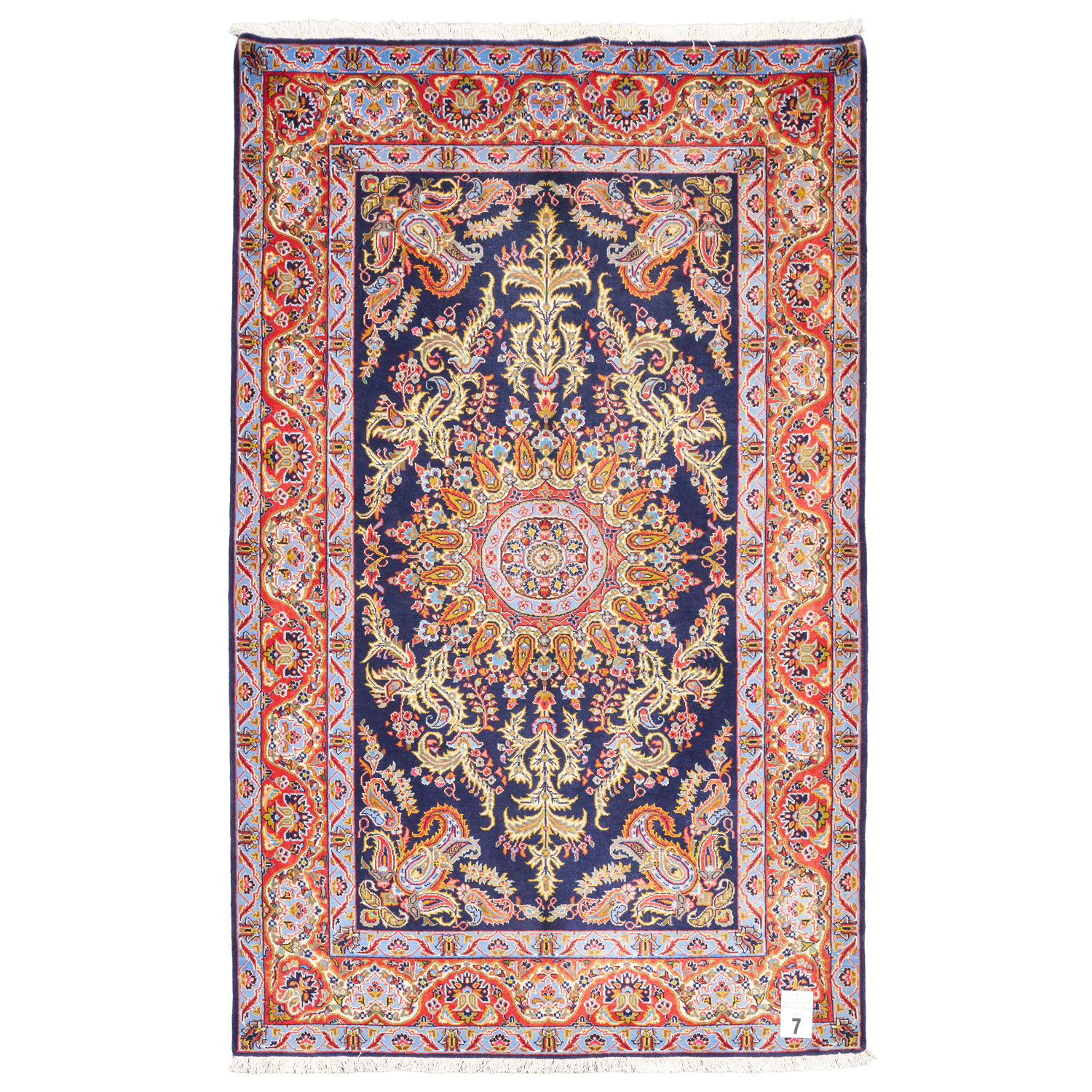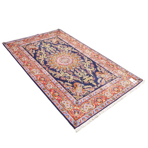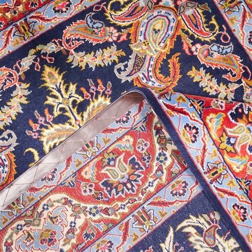 FINE WOOLLEN PILE WITH SILK INLAYS. FINELY HAND-KNOTTED CITY WEAVE OF 500,000 KNOTS PER SQUARE METER FROM THE ISFAHAN PROVINCE WITH A UNIQUE DESIGN OF DOMINANT SUNBURST MEDALLION & ELABORATE RAMBLING FLORAL SPRAYS SET AGAINST BOUQUETS OF PAISLEY MOTIFS SET WITHIN A ROYAL PERSIAN BLUE FIELD. BORDER OF PALMETTES & FLORAL SPRAYS. THE ENTIRE IN SHADES OF ROYAL BLUE, VERMILLION, CORNFLOWER BLUE, GREEN & CREAM WITH SAFFRON HIGHLIGHTS.