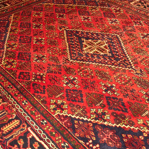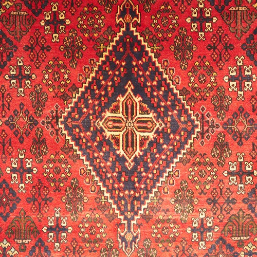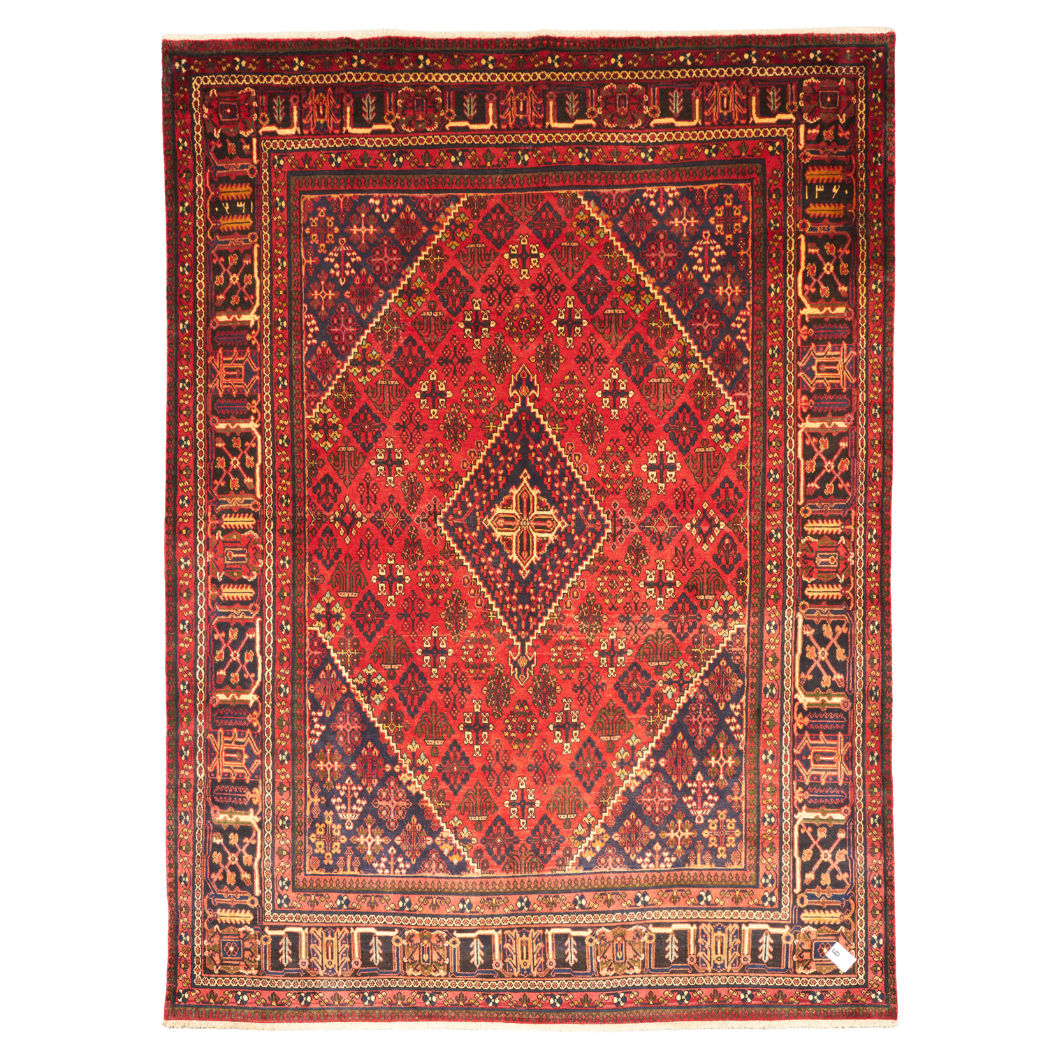 SEMI-VINTAGE WOOLLEN PILE. HAND-KNOTTED VILLAGE WEAVE FROM THE ISFAHAN PROVINCE WITH A DISTINCT DESIGN OF A DIAMOND-SHAPED MEDALLION SET AGAINST DIAGONAL ROWS OF STYLIZED FLORAL SPRAYS & TREE OF LIFE PATTERNS WITHIN A CRIMSON BACKGROUND. BORDER OF STYLIZED PALMETTES & LEAF FORMS. PROFESSIONALLY RESTORED.