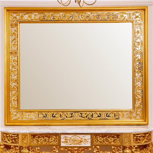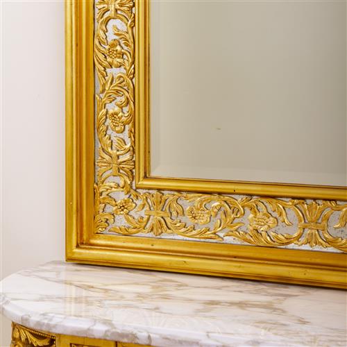 The gilt timber frame features an ornate carved border backed with faux mottled glass in the antique style.