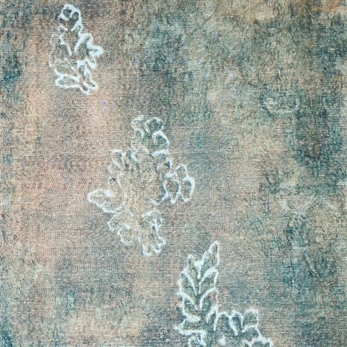 VINTAGE EMBOSSED PILE. A UNIQUE MODERN RUG CREATED FROM AN ORIGINAL HAND-KNOTTED MEDALLION DESIGN KERMAN CARPET, UNIQUELY OVER-DYED IN SHADES OF RUST, INDIGO & CHARCOAL WITH PASTEL BLUE HIGHLIGHTS
