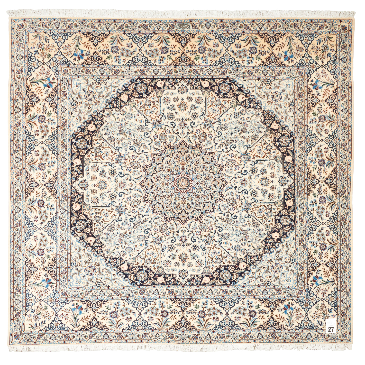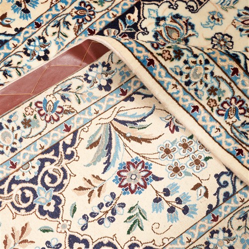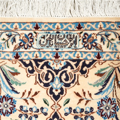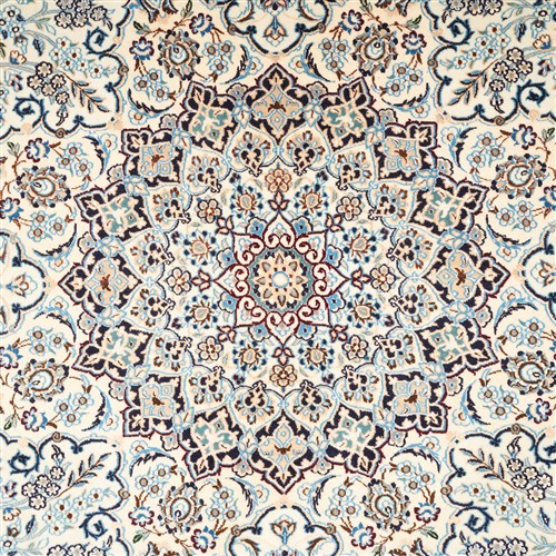 HIGH QUALITY LAMB'S WOOL (KORK) PILE INTER-KNOTTED WITH SILK INLAYS. FINELY HAND-KNOTTED WEAVE OF APPROXIMATELY 700,000 KNOTS PER SQUARE METER BY "HABIBIAN" MASTER-WEAVING ATELIER. SIGNED PIECE. UNIQUE NAIEN DESIGN OF A SUNBURST MEDALLION IN A FIELD OF PALMETTES BLOSSOMING TREES OF LIFE, PALMETTES & FLORAL SPRAYS. WIDE PANELLED BORDER OF SEMI-MEDALLIONS & FLORAL SHRUBS. THE ENTIRE IN SHADES OF CREAM, INDIGO, CERULEAN BLUE, SOFT TAUPE, IVORY WITH MAROON HIGHLIGHTS.