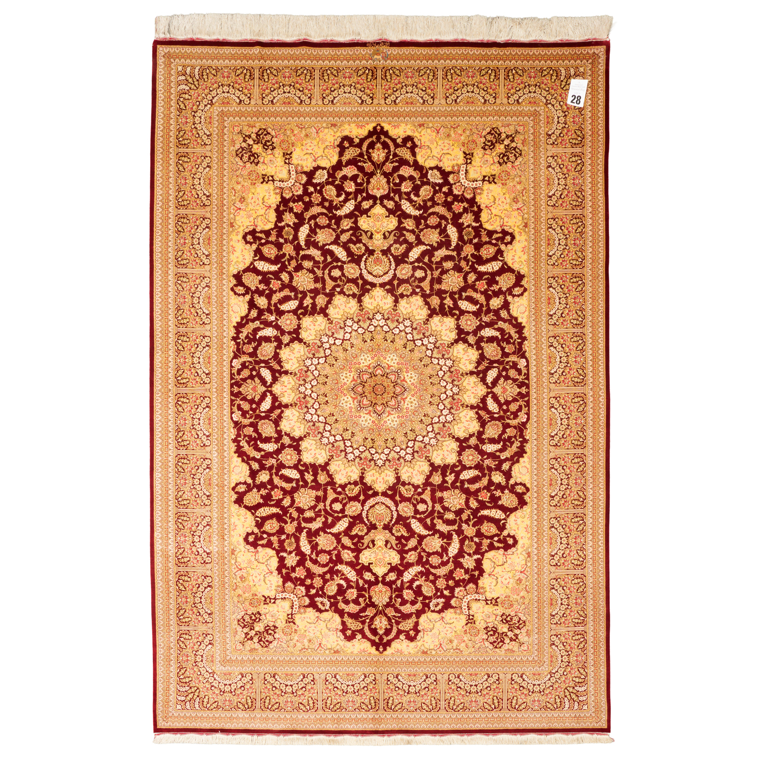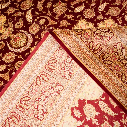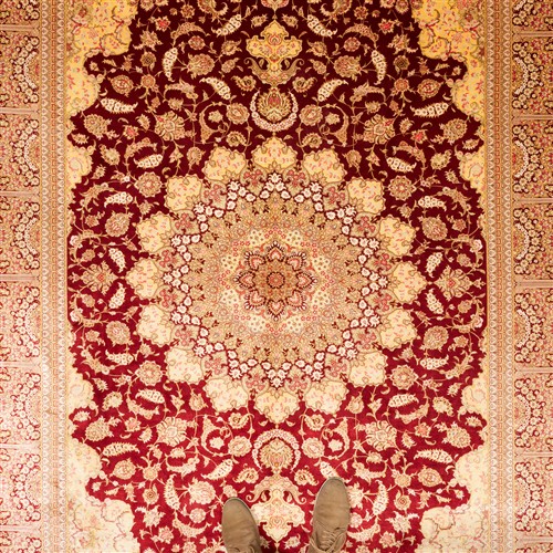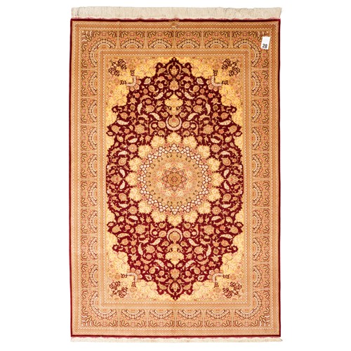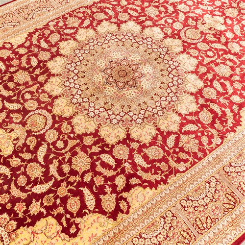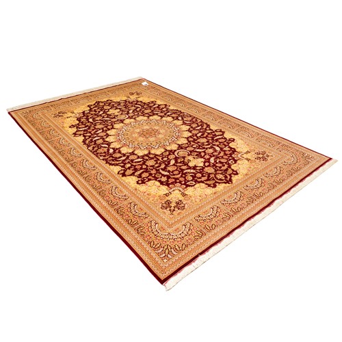 CASPIAN SILK. SUPERBLY HAND-KNOTTED WEAVE OF 800,000 KNOTS PER SQUARE METER BY "SADEGHZADEH" MASTER WEAVING ATELIER. SIGNED PIECE WITH THE PERSIAN ROYAL EMBLEM OF THE LION, SUN & SWORD. CLASSIC QUM FLORAL DESIGN OF A DOMINANT FLORAL MEDALLION & QUARTERED CORNER MEDALLIONS WITHIN A RUBY RED FIELD OF PALMETTES, BLOSSOMING FLORAL SPRAYS & SAZ LEAVES. PANELLED BORDER OF PALMETTES & FLORAL SPRAYS. THE ENTIRE IN SHADES OF RUBY RED, SPRING GREEN, CHAMPAGNE & ROSE.