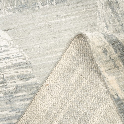 WOOL PILE & SILK-TEXTURED FIBERS WITH VERTICAL & HORIZONTAL DISTRESSED & EMBOSSED LINEAR PATTERNS. THE ENTIRE IN SHADES OF SILVER, GREYS & PEACH.
