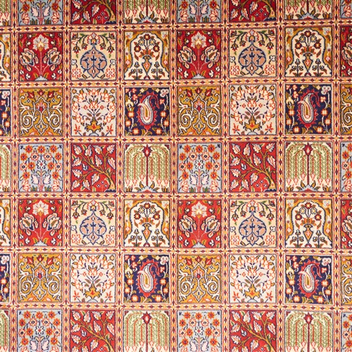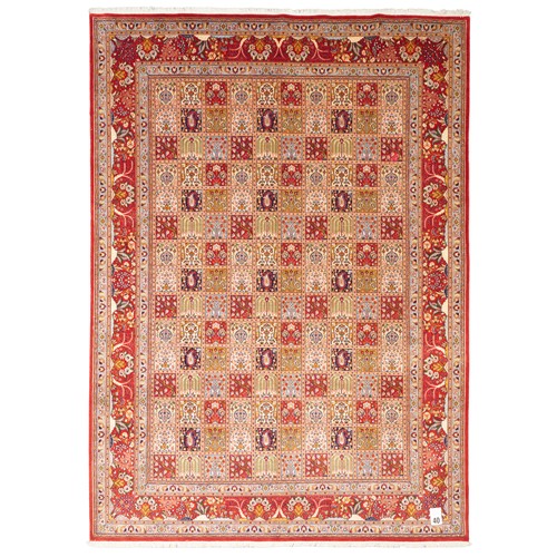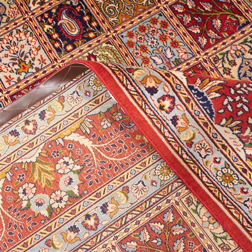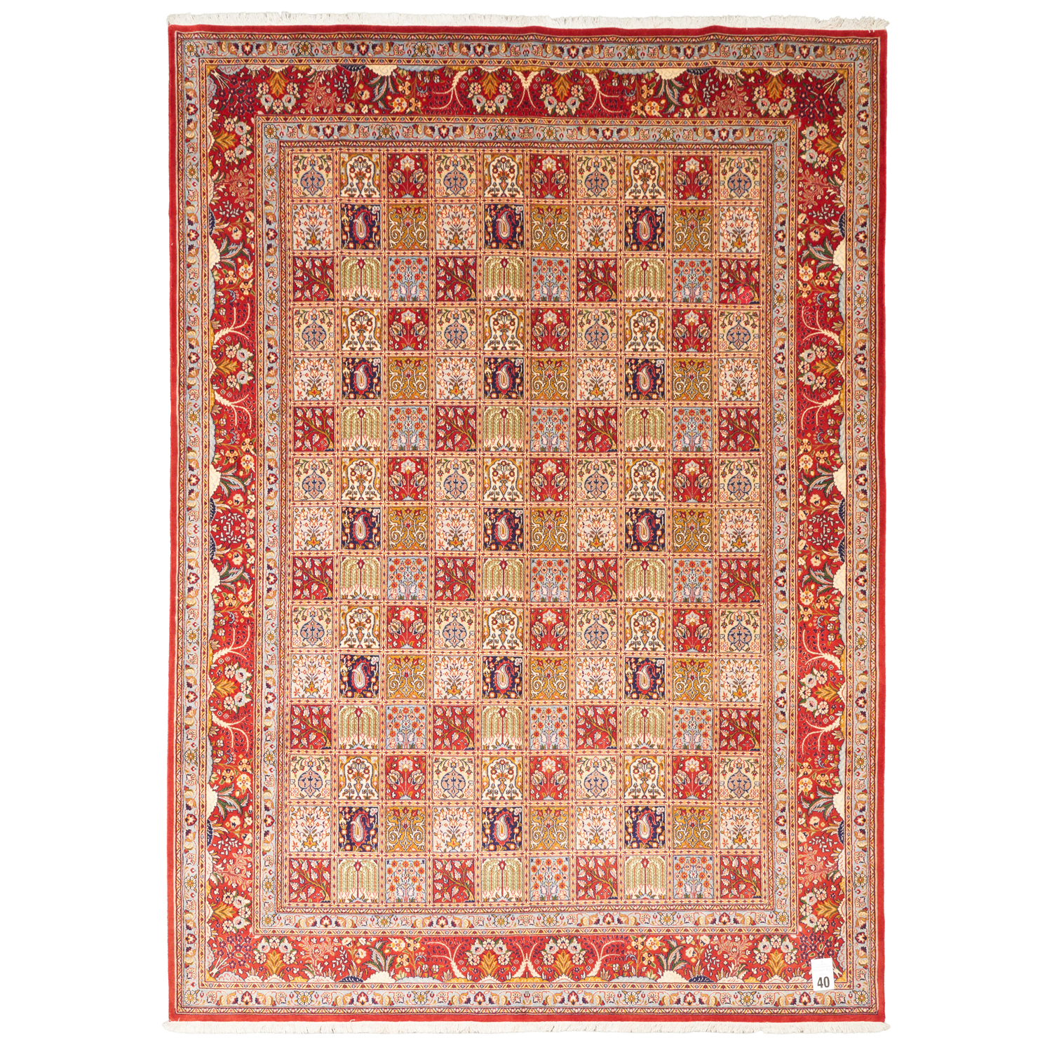 DENSE LAMB'S WOOL PILE. FINELY HAND-KNOTTED CITY WEAVE FROM THE NORTH-EASTERN KHORASAN PROVINCE WITH A TRADITIONAL PICTORIAL GARDEN DESIGN OF RECTANGULAR PANELS CONTAINING GARDEN THEMES OF WILLOW TREES, FLORAL SHRUBS, AUTUMN TREES & PAISLEY MOTIFS. BORDER OF VARYING FLORAL SHRUBS. THE ENTIRE IN HUES OF CRIMSON, GREEN, CORNFLOWER BLUE & CREAM. GALLERY EXHIBITED. ORIGIN: IRAN