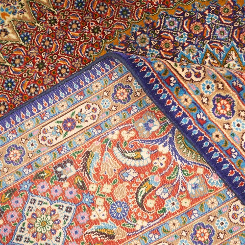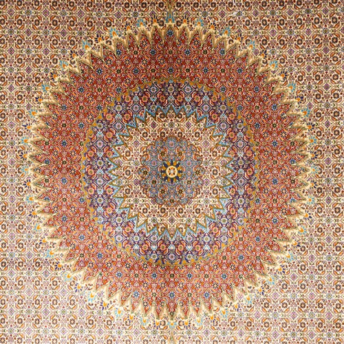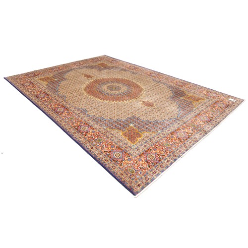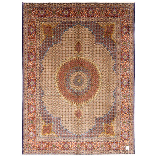 WOOLLEN PILE INTER-KNOTTED WITH SILK. FINELY HAND-KNOTTED CITY WEAVE OF 500,000 KNOTS PER SQUARE METER FROM THE NORTH-EASTERN KHORASAN PROVINCE WITH DESIGN OF A 64-POINT SUNBURST MEDALLION & CORNER MEDALLIONS A FIELD OF FLORAL HERATI MAHI MOTIFS. BORDER OF SPRAYS OF PAISLEY MOTIFS & ROSETTES. THE ENTIRE IN SHADES OF CREAM, MAROON, INDIGO, BURNT ORANGE, TAUPE & AZURE BLUE. GALLERY EXHIBITED.