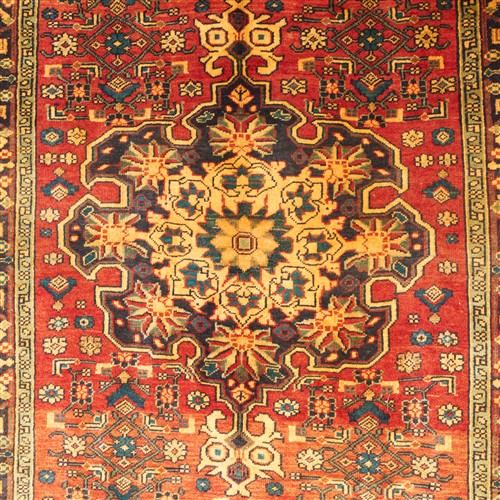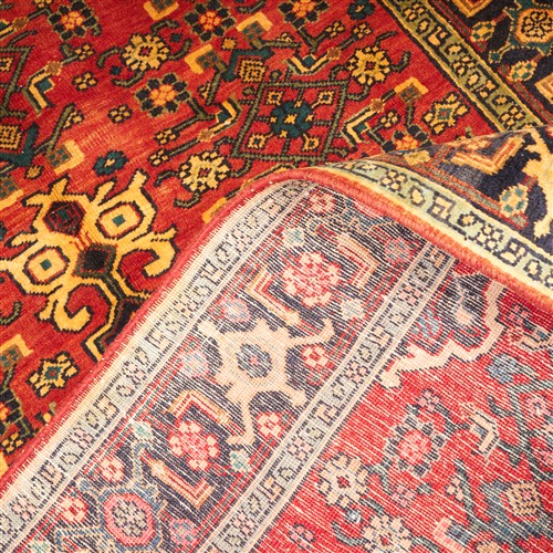 WOOLLEN PILE. HAND-KNOTTED VILLAGE WEAVE FROM THE ARAK PROVINCE WITH DESIGN OF A BOLD FLORAL MEDALLION & CORNER MEDALLIONS IN A FIELD OF BOLD HERATI MAHI MOTIFS. HERATI-PATTERNED BORDER.