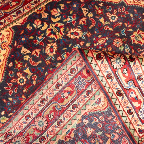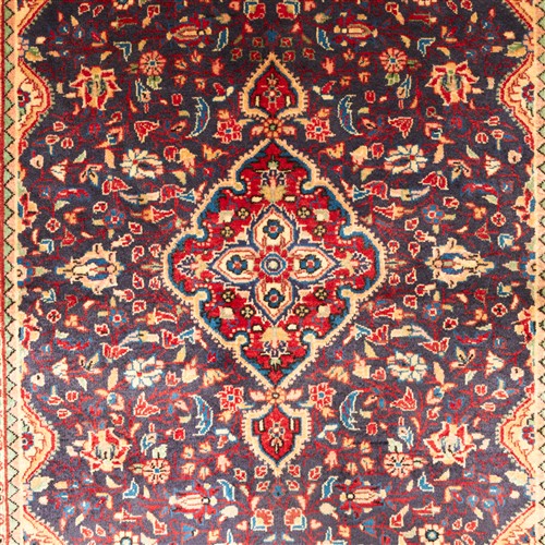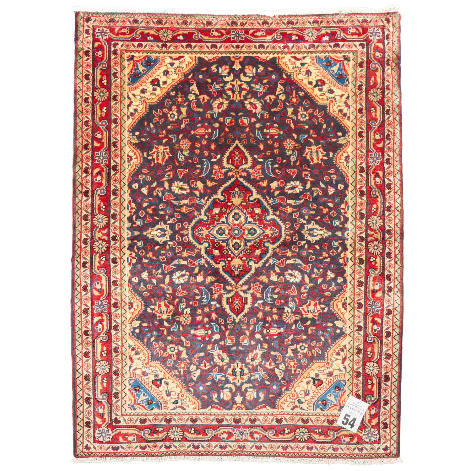 WOOL PILE. FINELY HAND-KNOTTED VILLAGE WEAVE FROM THE MALAYER REGION WITH TRADITIONAL DESIGN OF A CHANDELIER MEDALLION & CORNER MEDALLIONS IN AN INDIGO FIELD OF PALMETTES & FLORAL MOTIFS. BORDER OF ROSETTES. ORIGIN: IRAN