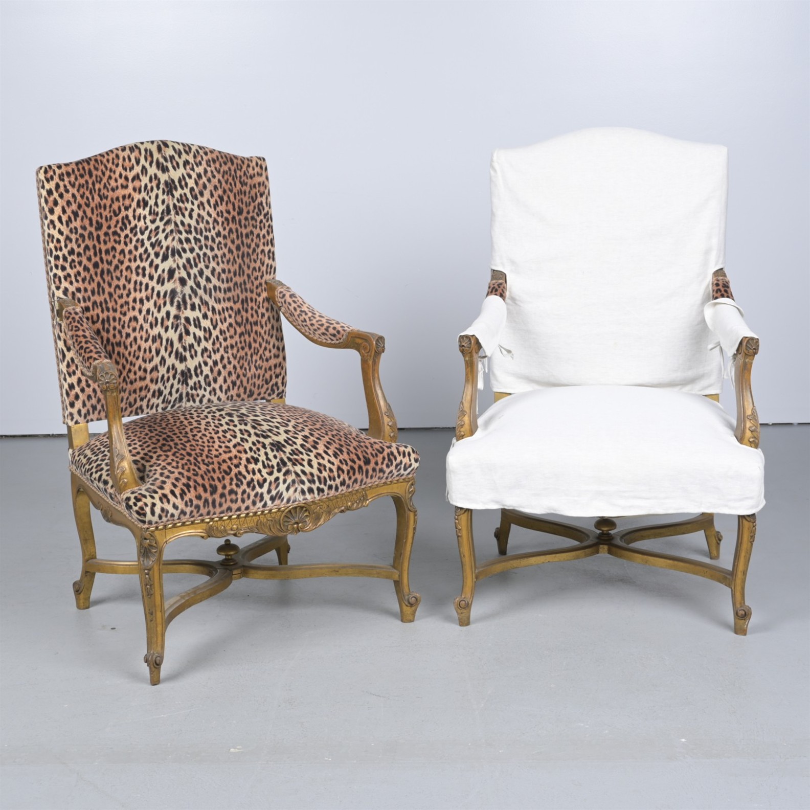 A PAIR OF REGENCE-STYLE FAUTEUILS UPHOLSTERED IN CHEETAH PRINT FABRIC (ONE IN A SLIPCOVER) (112CM H X 70CM W X 60CM D)