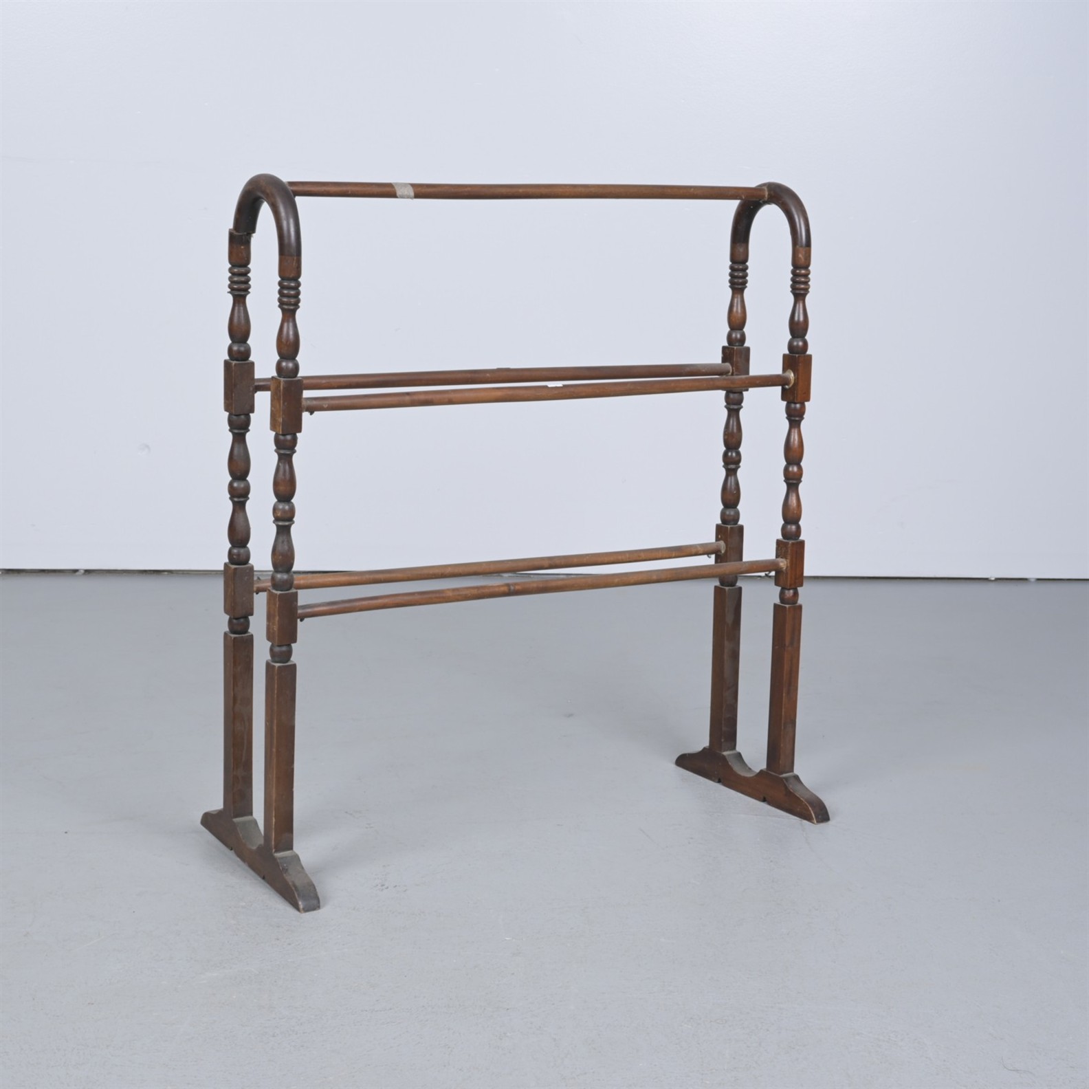 A VICTORIAN HARDWOOD TOWEL RAIL (91CM H X 81CM W X 33CM D)