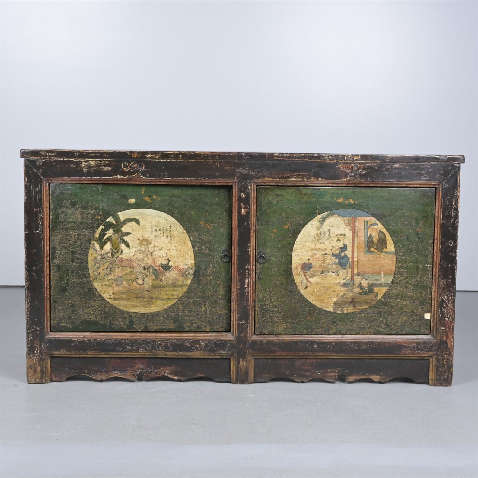 AN ANTIQUE CHINESE DECORATED SIDE CABINET (86CM H X 160CM W X 47CM D)